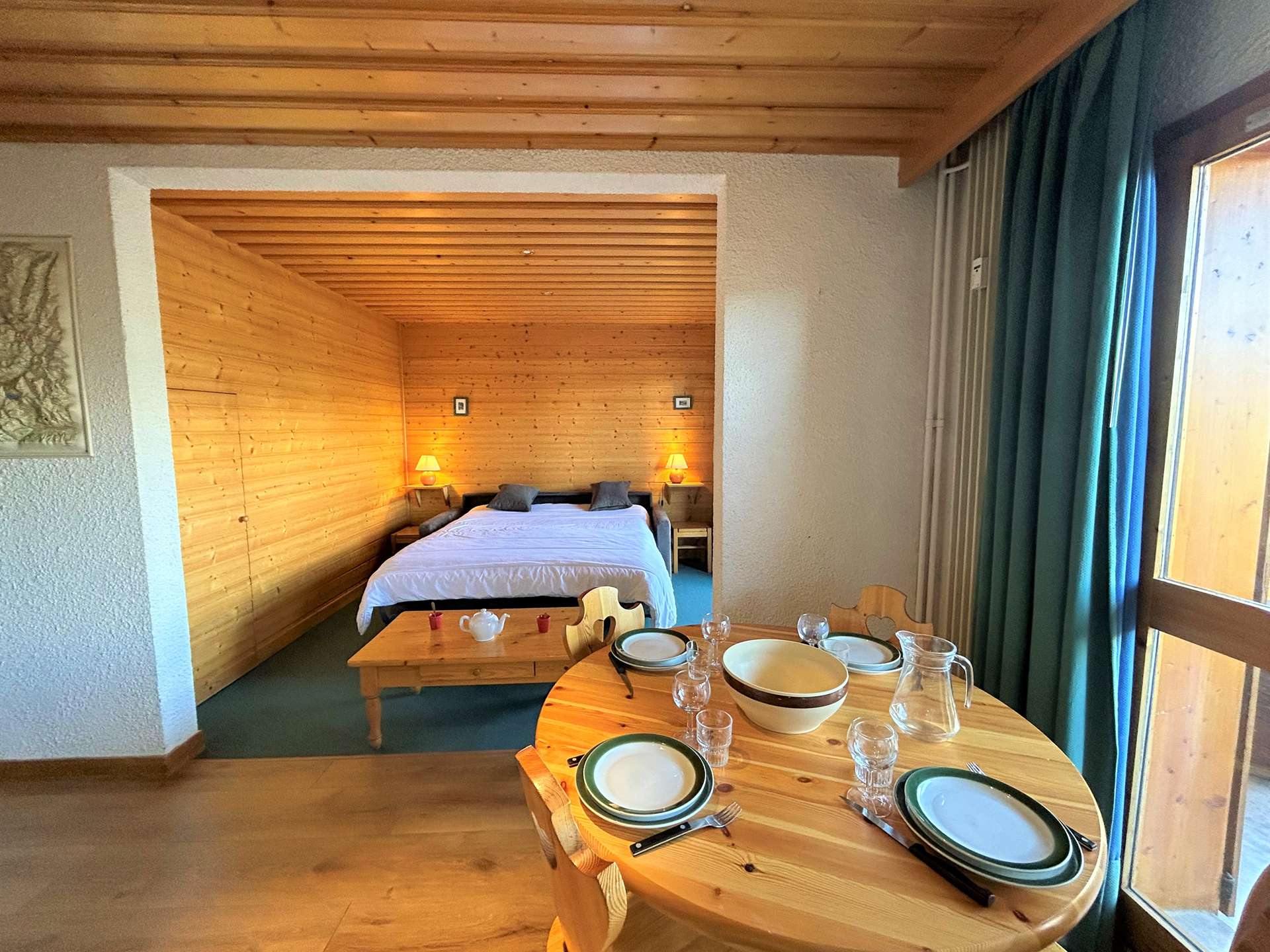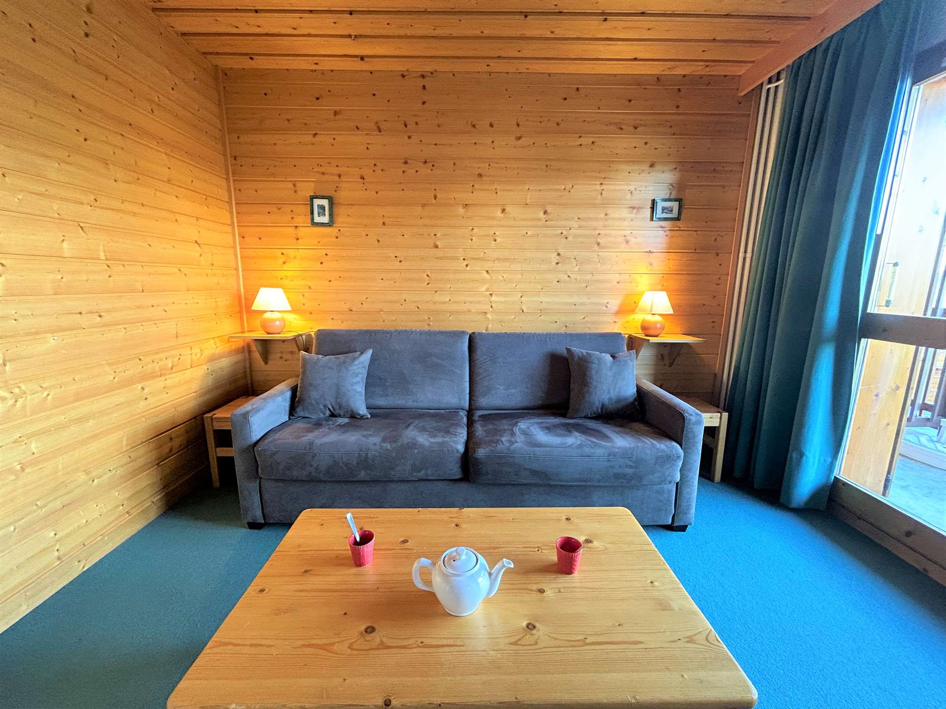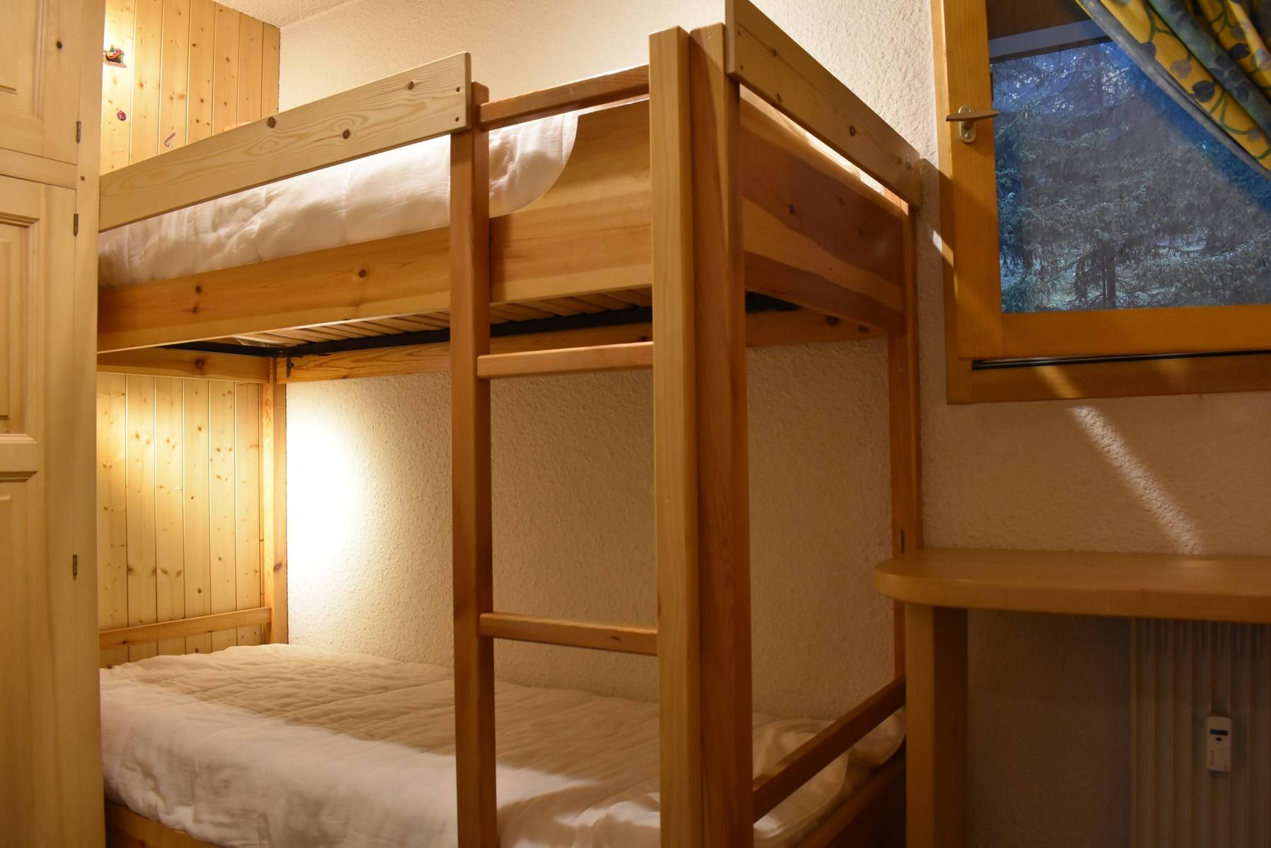 Cette location à la montagne comprend un séjour avec un canapé lit 2 personnes et une télévision, une cuisine équipée, une chambre avec un ensemble de lits superposés, une salle de bain et un wc indépendant.