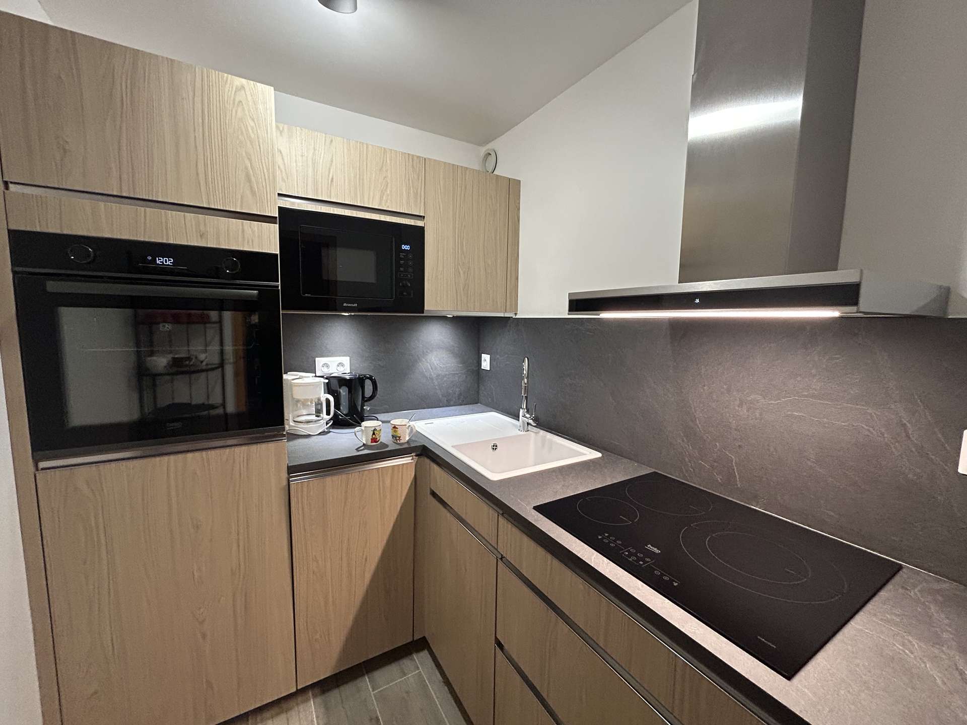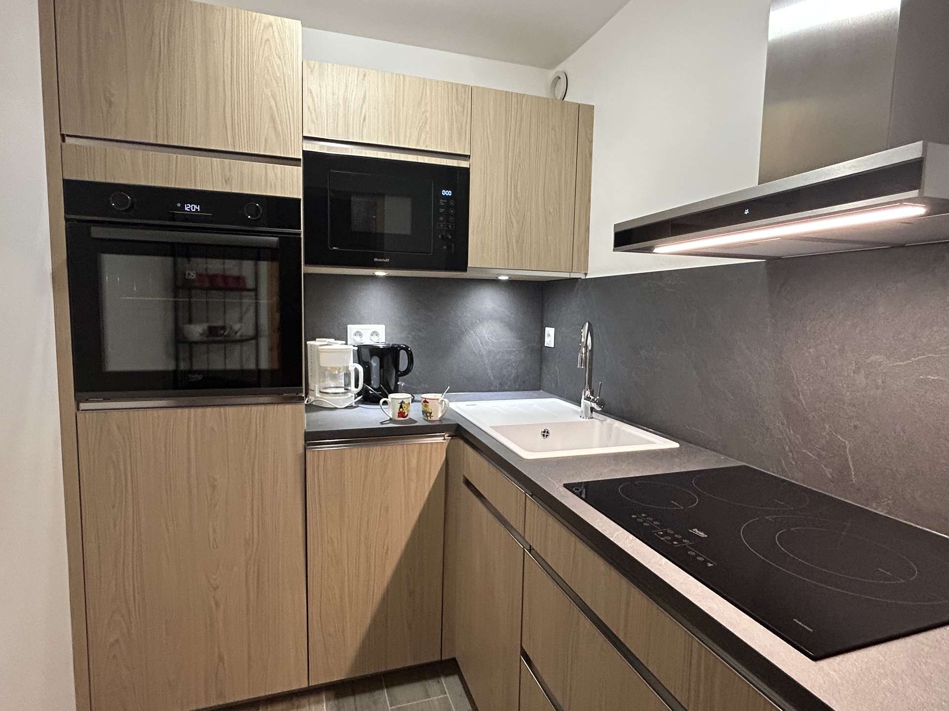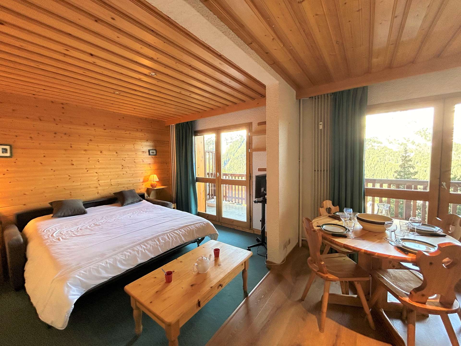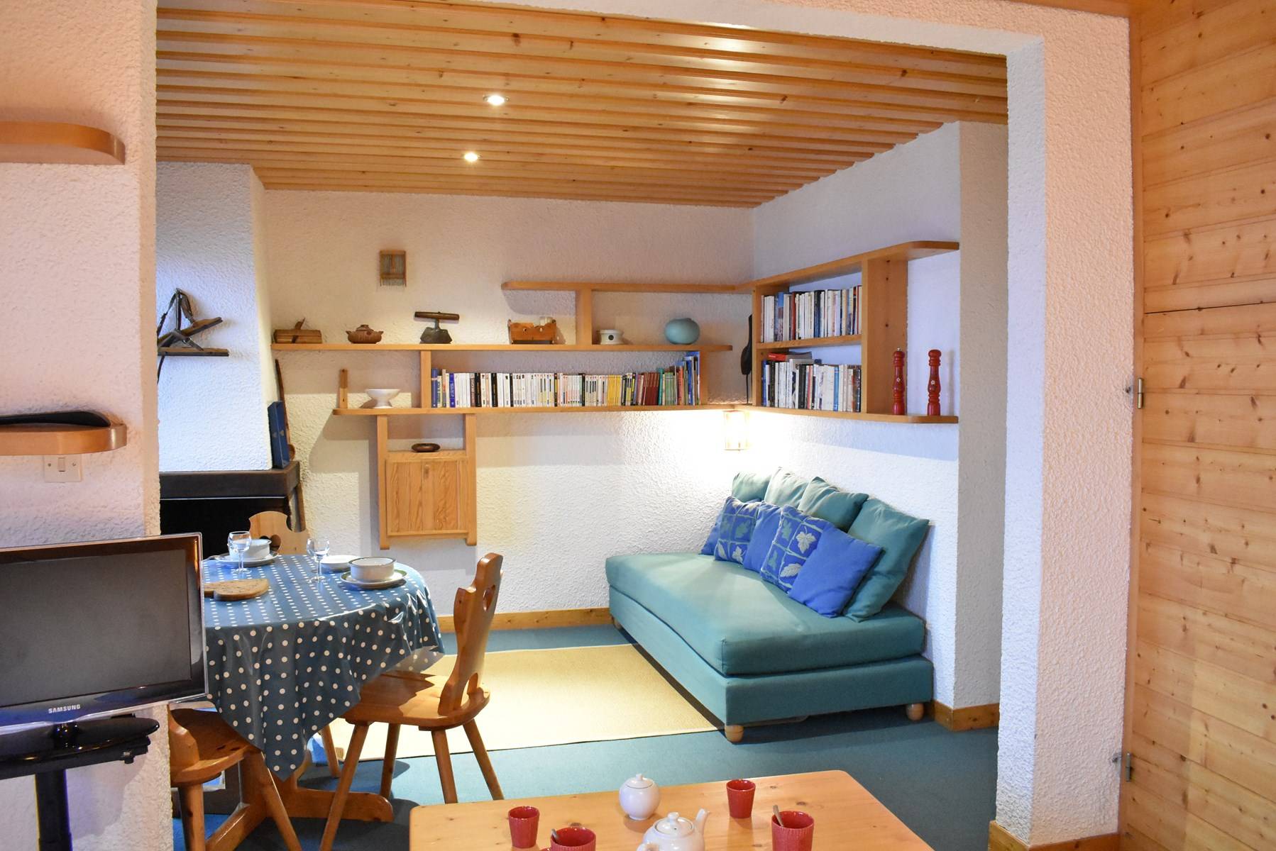 Cette location à la montagne comprend un séjour avec un canapé lit 2 personnes et une télévision, une cuisine équipée, une chambre avec un ensemble de lits superposés, une salle de bain et un wc indépendant.