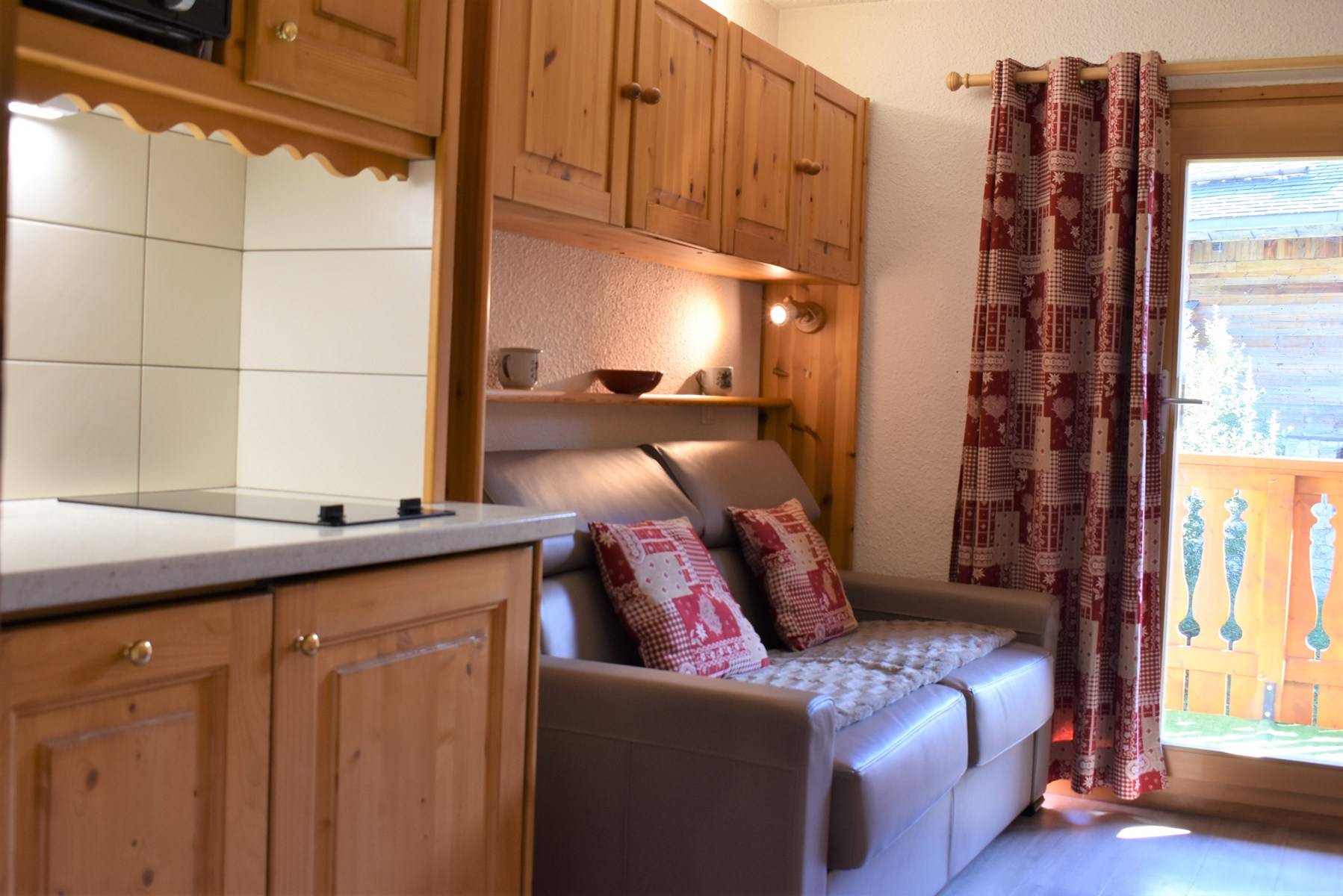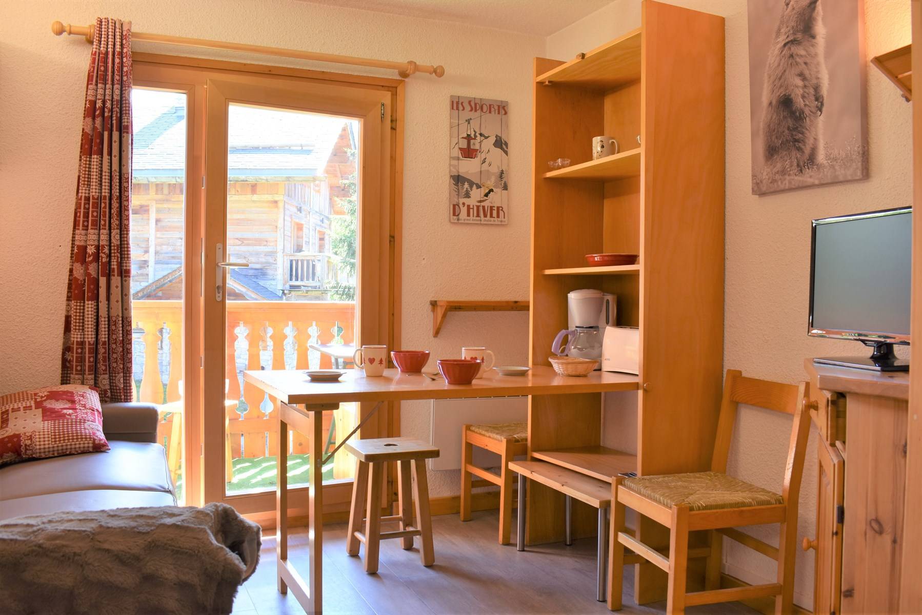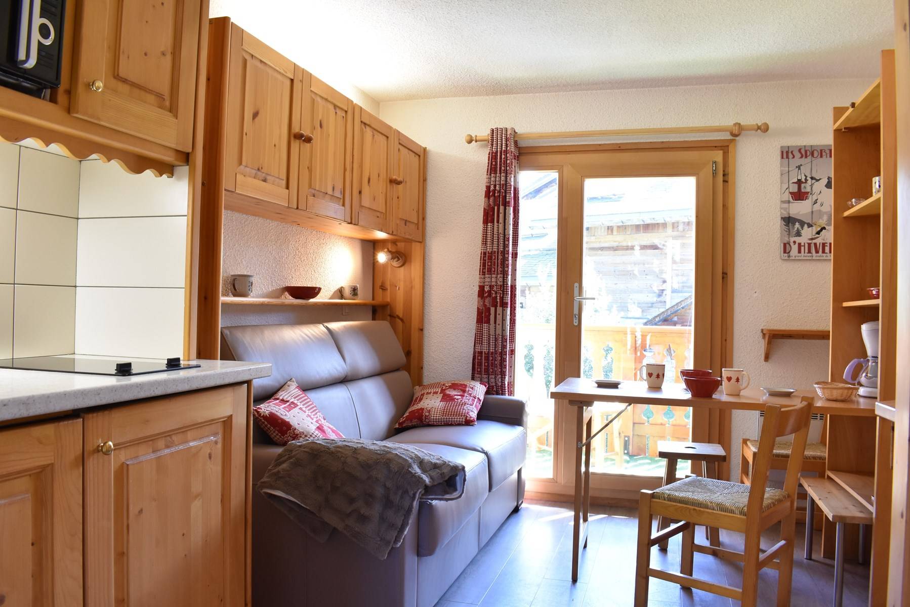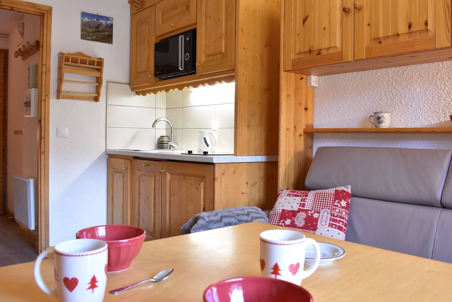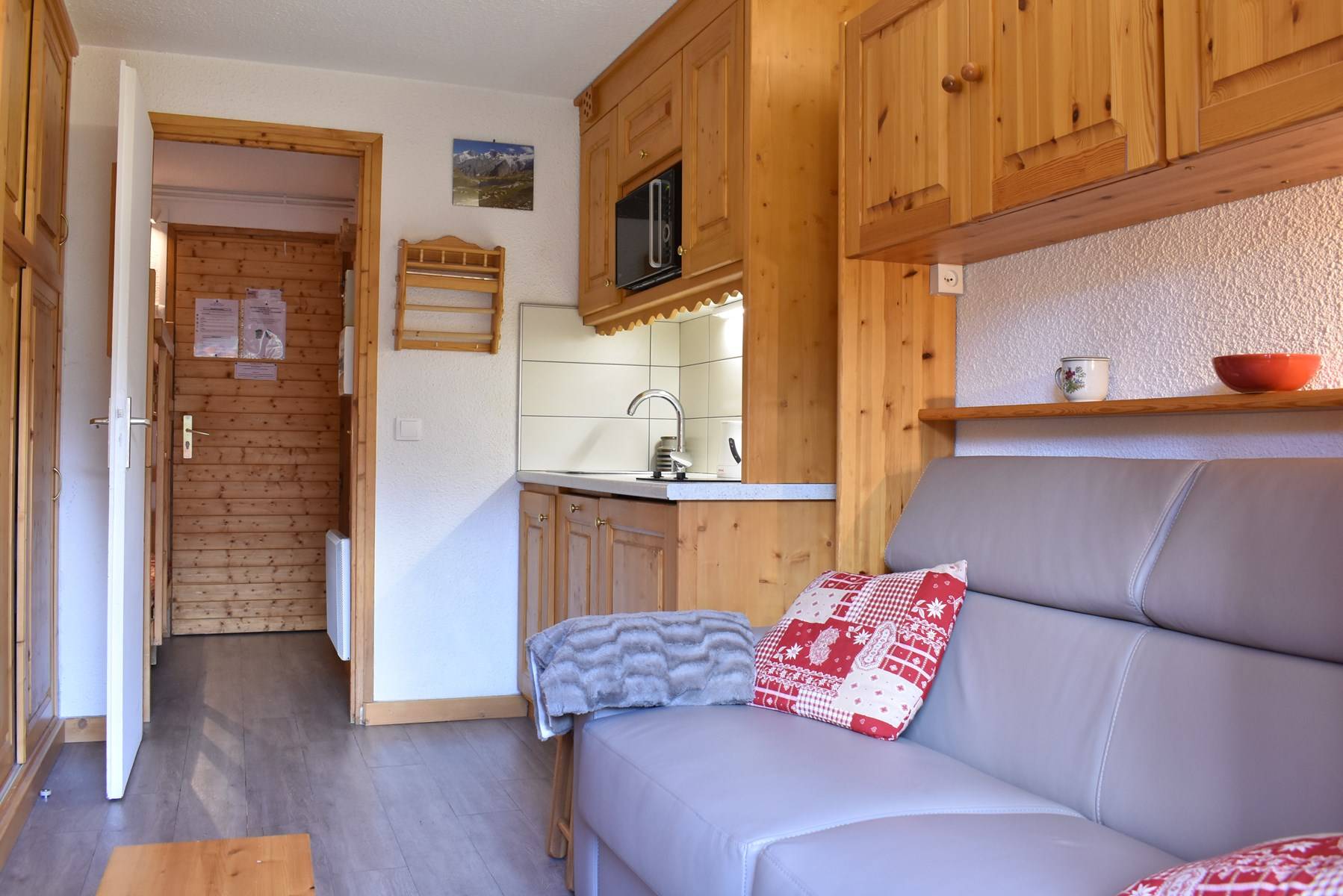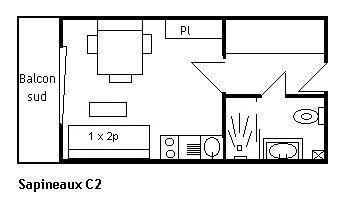 Cet appartement Studio à la neige situé au 2ème étage, sans ascenseur, comprend une cuisine équipée d'un lave-vaisselle ouverte sur le séjour avec un canapé lit 2 personnes 140 avec coin repas et télévision donnant sur un balcon Sud, une entrée avec 1 lit 1 personne et une salle d'eau avec WC.