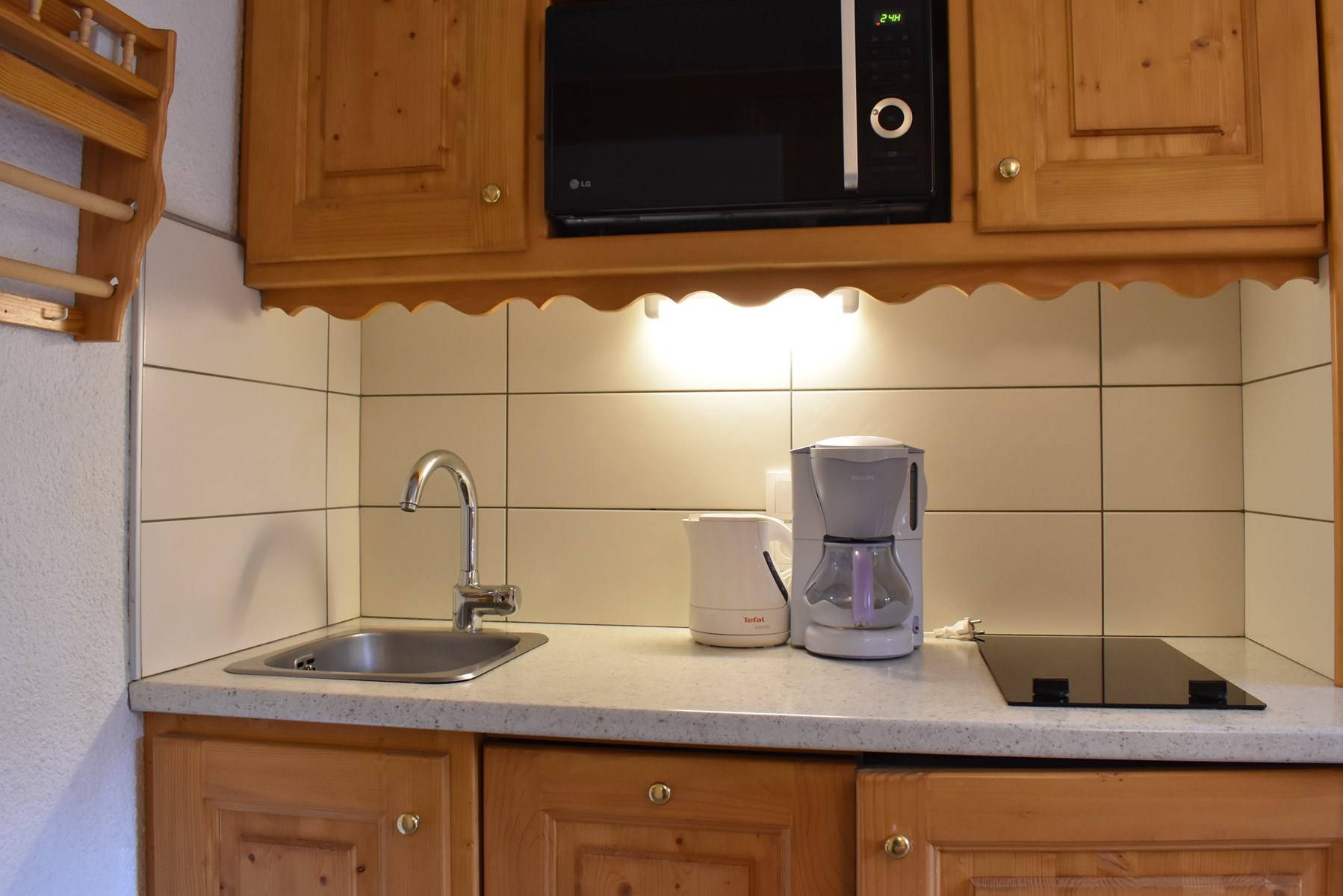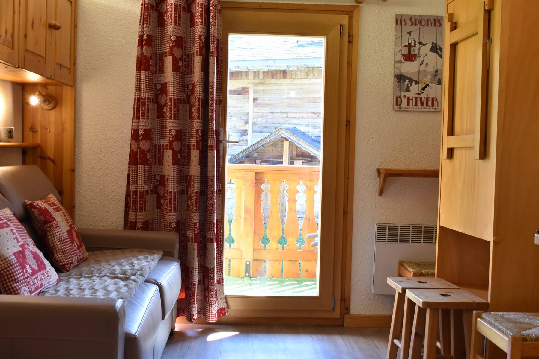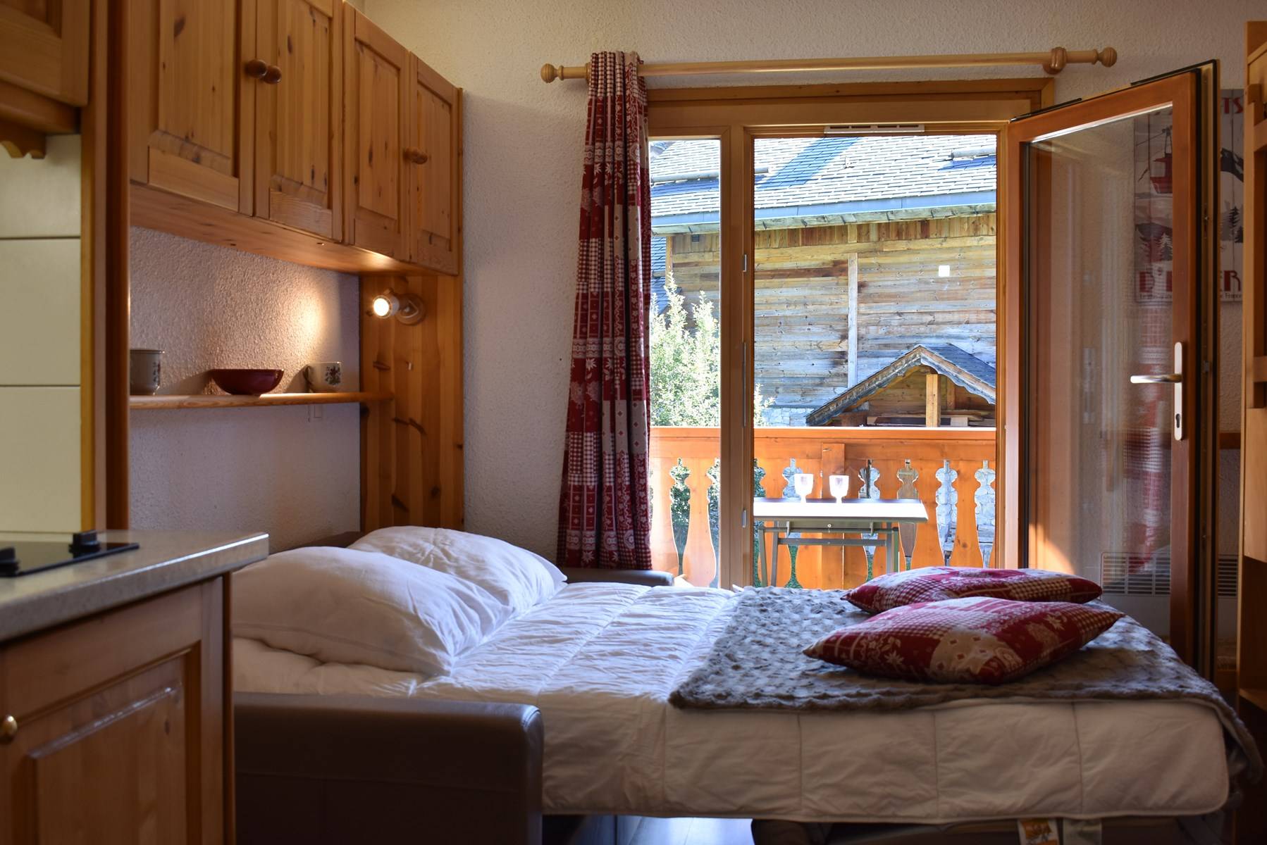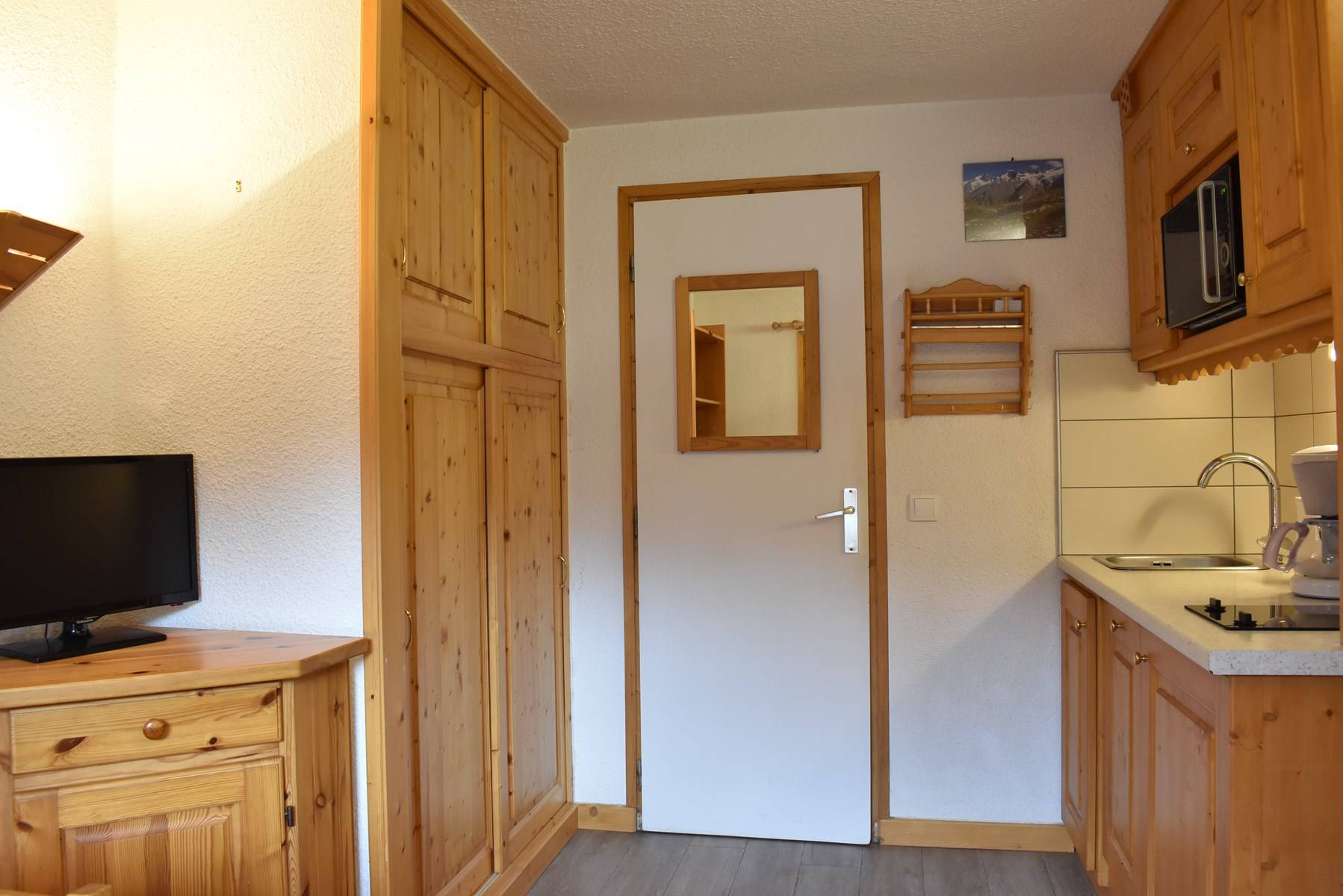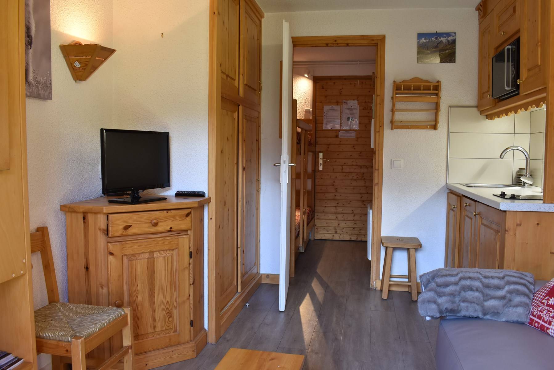 Cet appartement Studio à la neige situé au 2ème étage, sans ascenseur, comprend une cuisine équipée d'un lave-vaisselle ouverte sur le séjour avec un canapé lit 2 personnes 140 avec coin repas et télévision donnant sur un balcon Sud, une entrée avec 1 lit 1 personne et une salle d'eau avec WC.