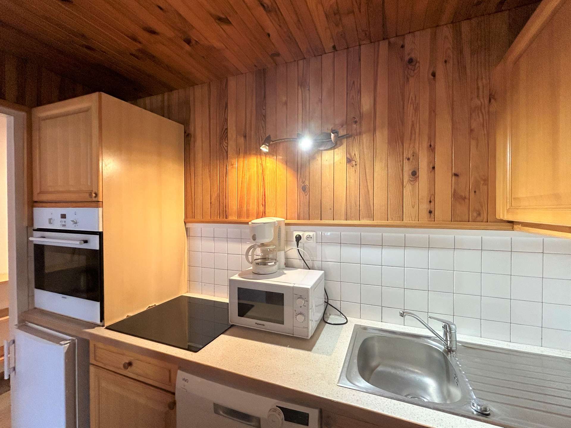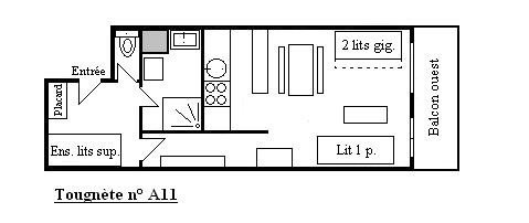 Cet appartement à la neige situé au 2ème étage, sans ascenseur, comprend une cuisine équipée ouverte sur le séjour avec 1 ensemble de lits gigognes relevables, 1 lit 1 personne et 1 télévision, 1 entrée avec 1 ensemble de lits superposés, 1 salle d'eau et un WC indépendant.