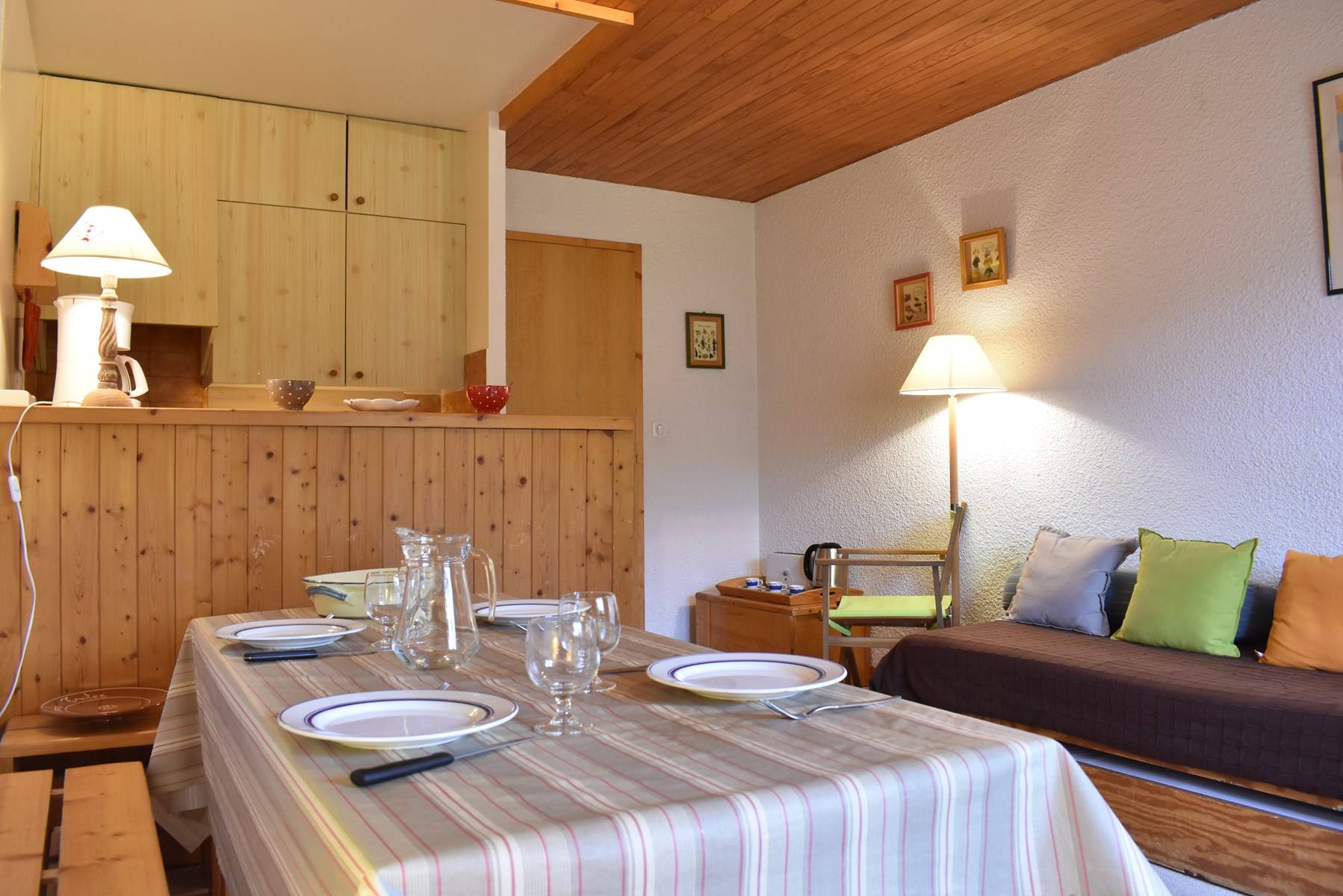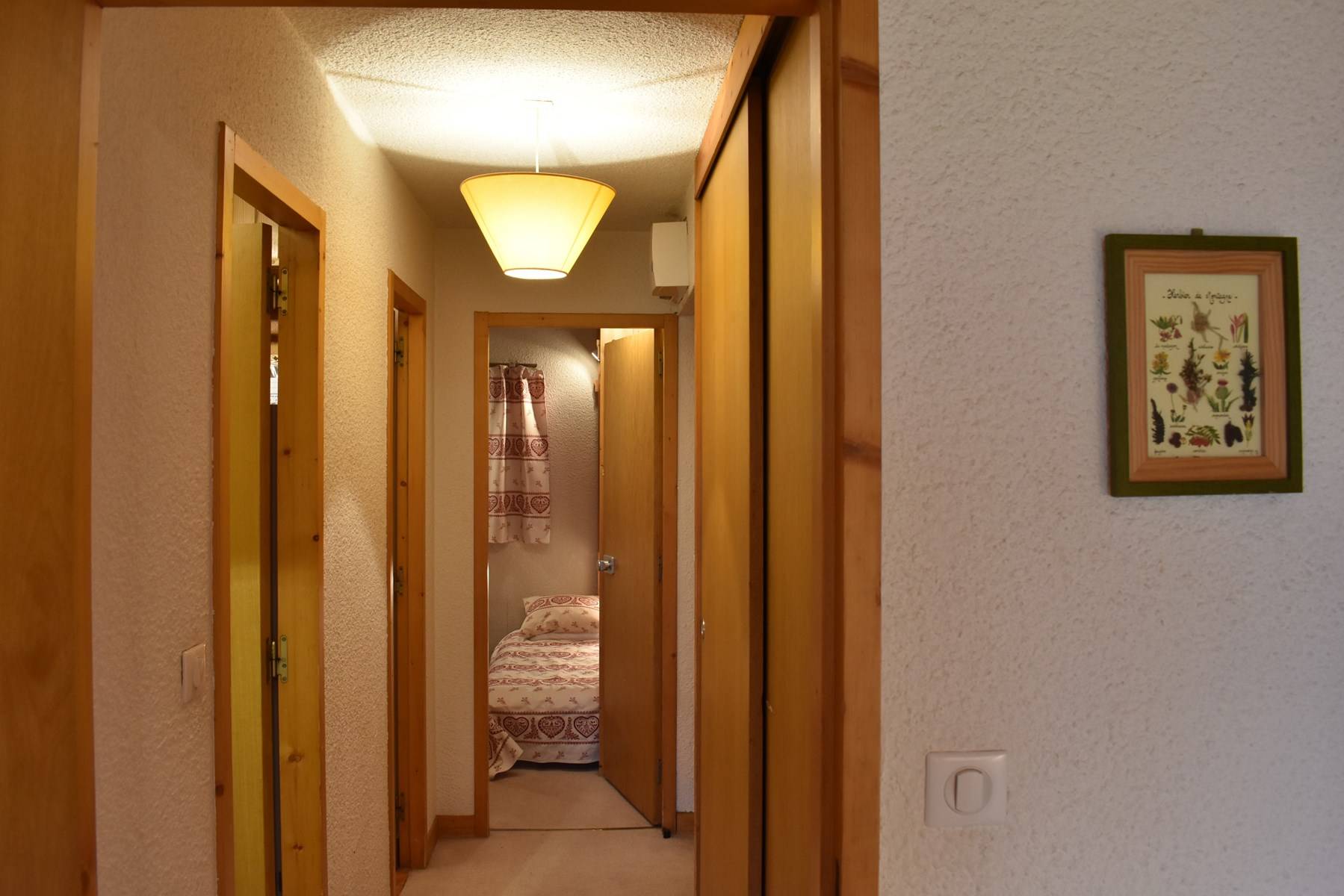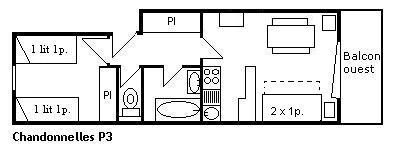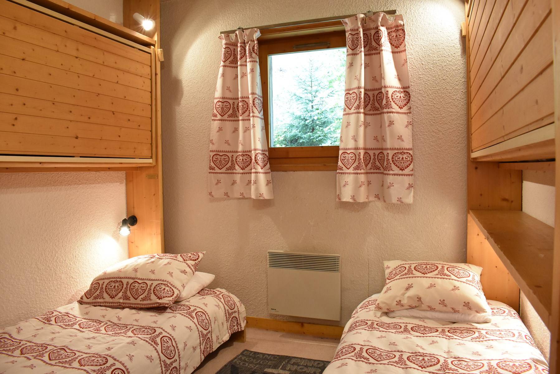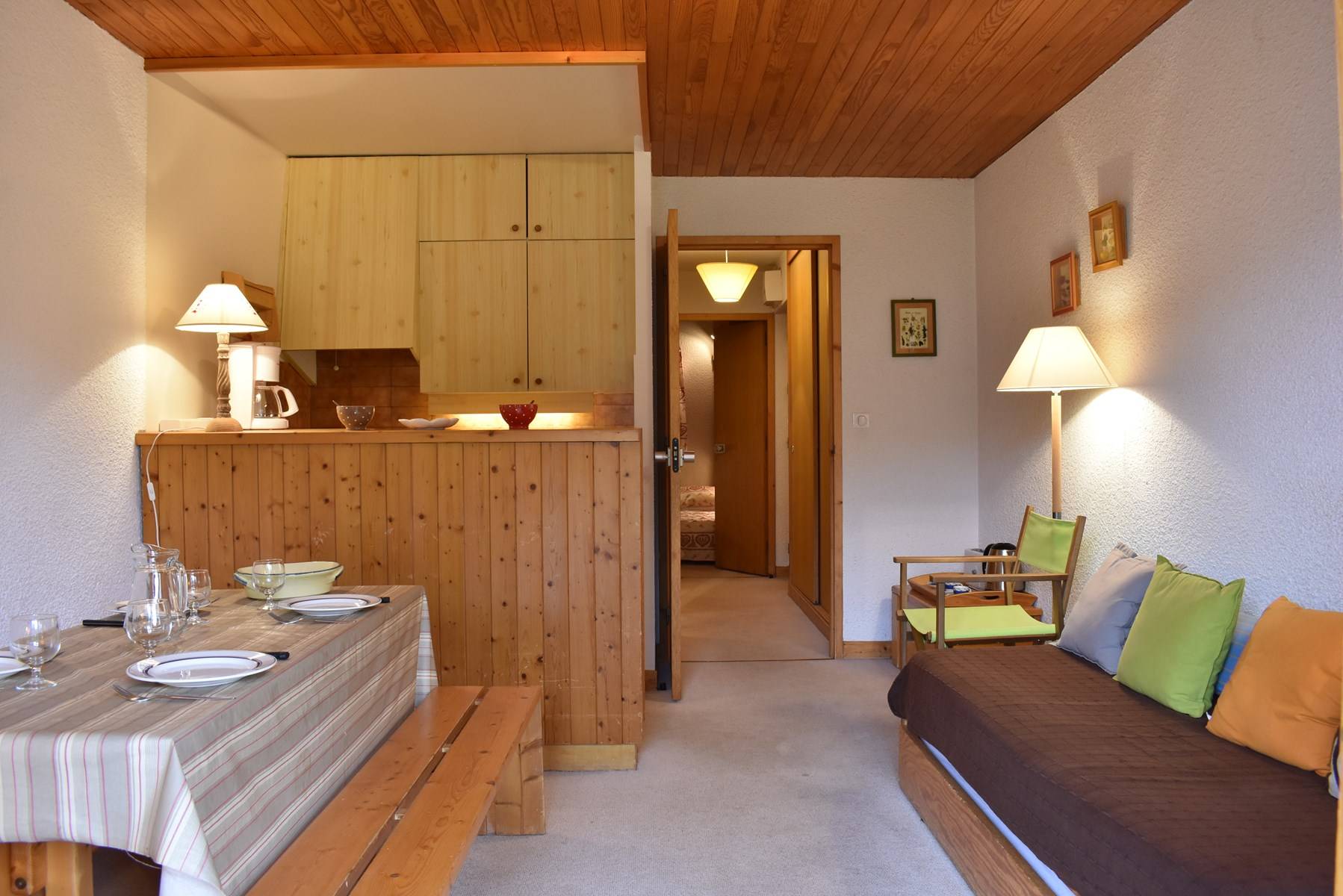 Cet appartement, accessible par ascenseur, se trouve au premier étage de la résidence. Il comprend une cuisine équipée ouverte sur le séjour avec deux lits gigognes relevables, une télévision avec lecteur DVD intégré, une chambre avec 2 lits simples, une salle de bain et un wc indépendant. Un casier à skis est disponible au niveau de l'entrée de la résidence.