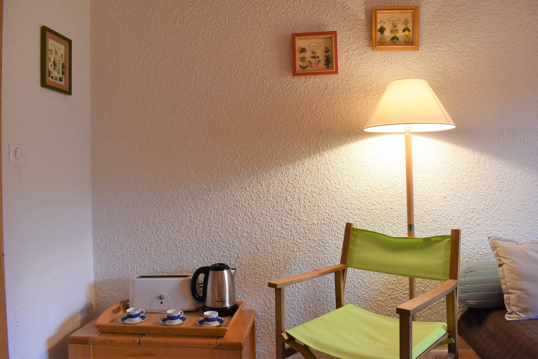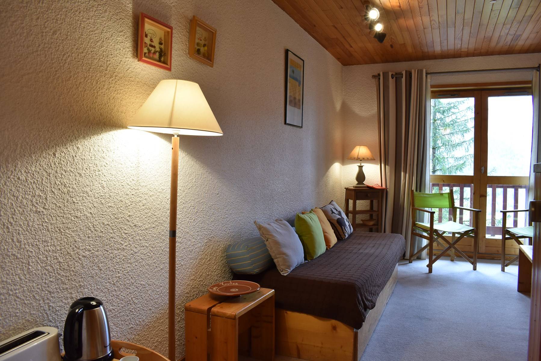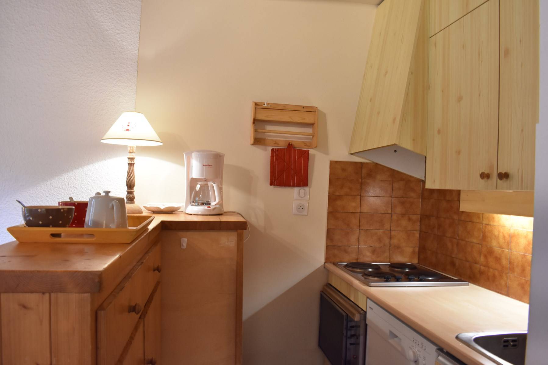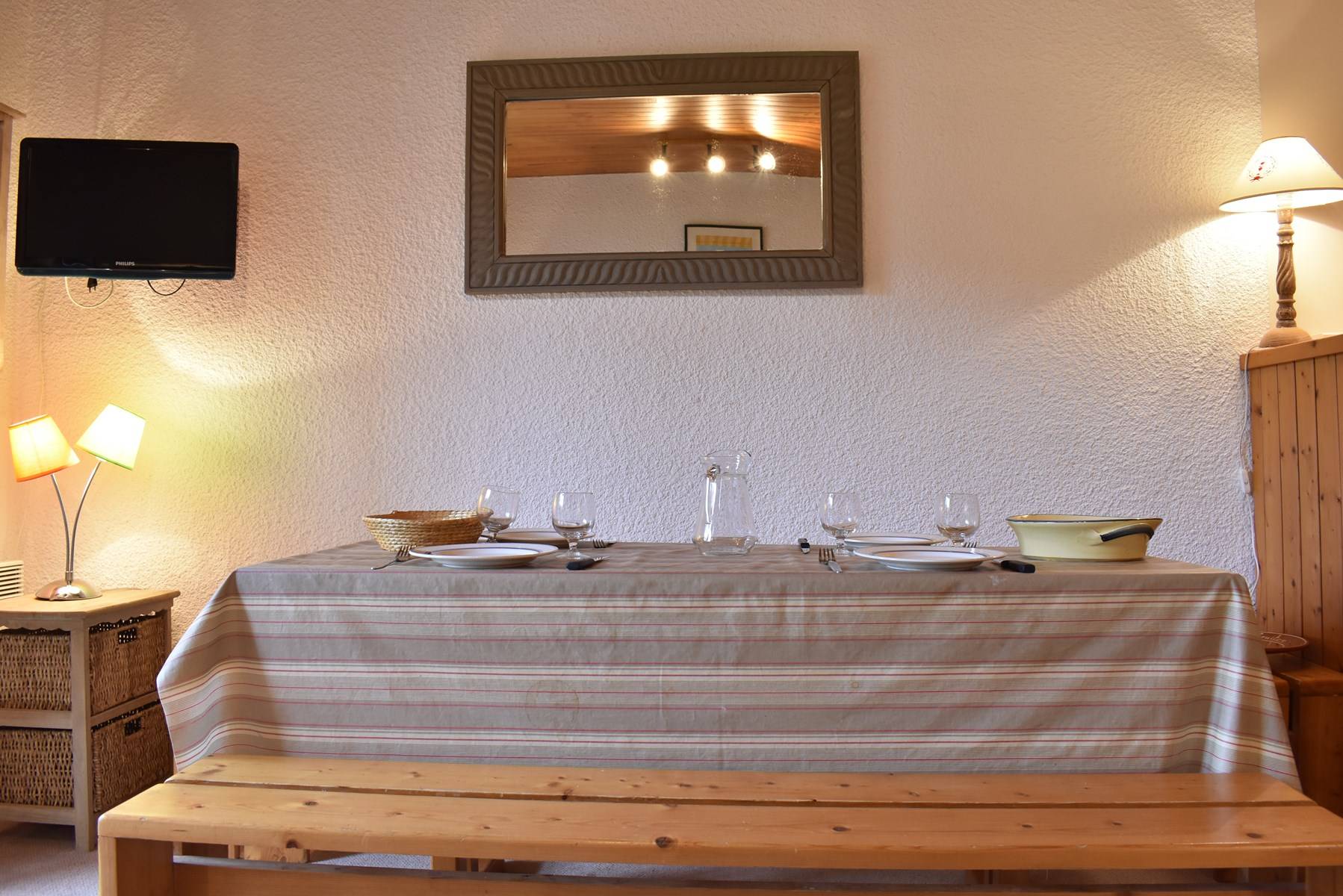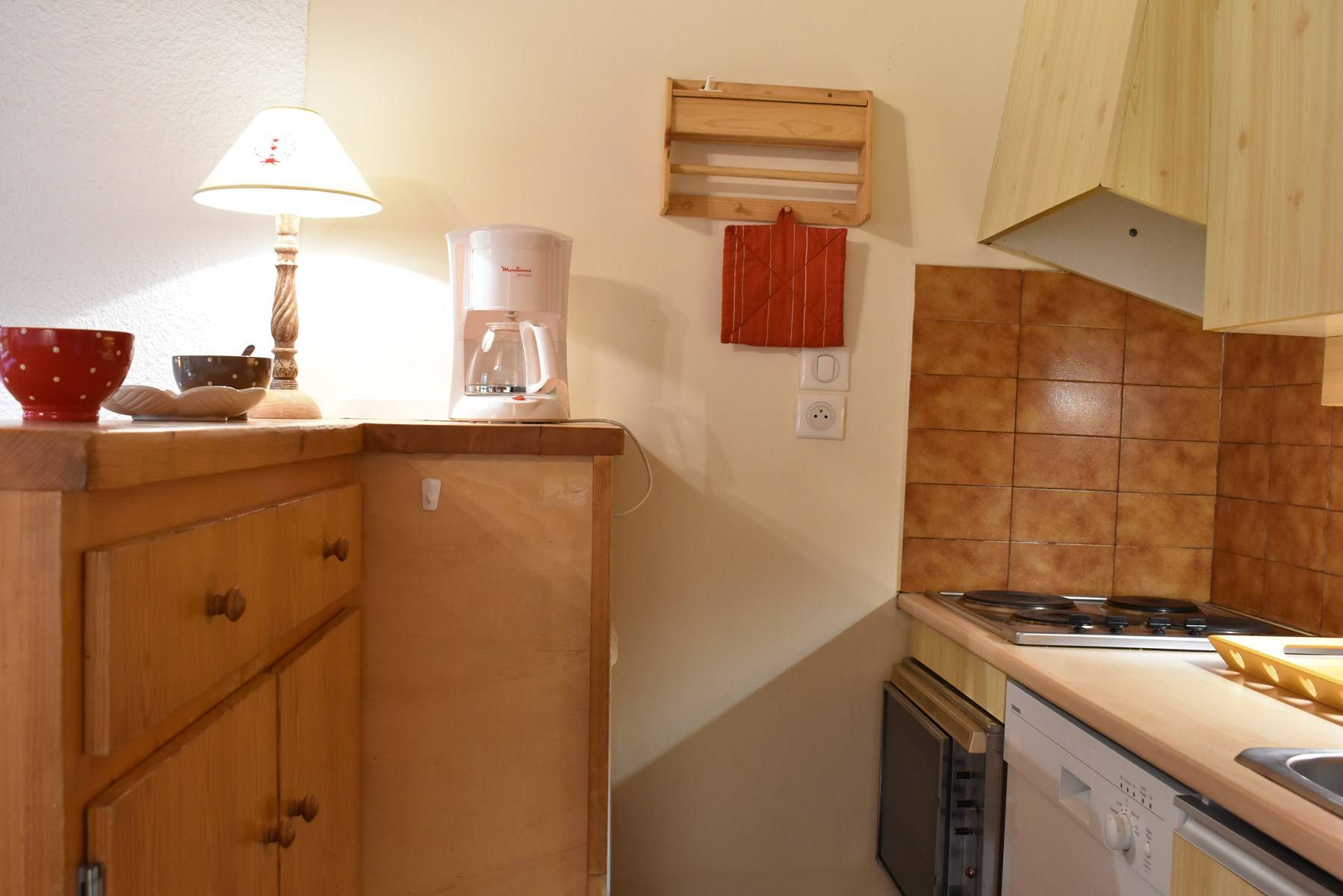 Cet appartement, accessible par ascenseur, se trouve au premier étage de la résidence. Il comprend une cuisine équipée ouverte sur le séjour avec deux lits gigognes relevables, une télévision avec lecteur DVD intégré, une chambre avec 2 lits simples, une salle de bain et un wc indépendant. Un casier à skis est disponible au niveau de l'entrée de la résidence.