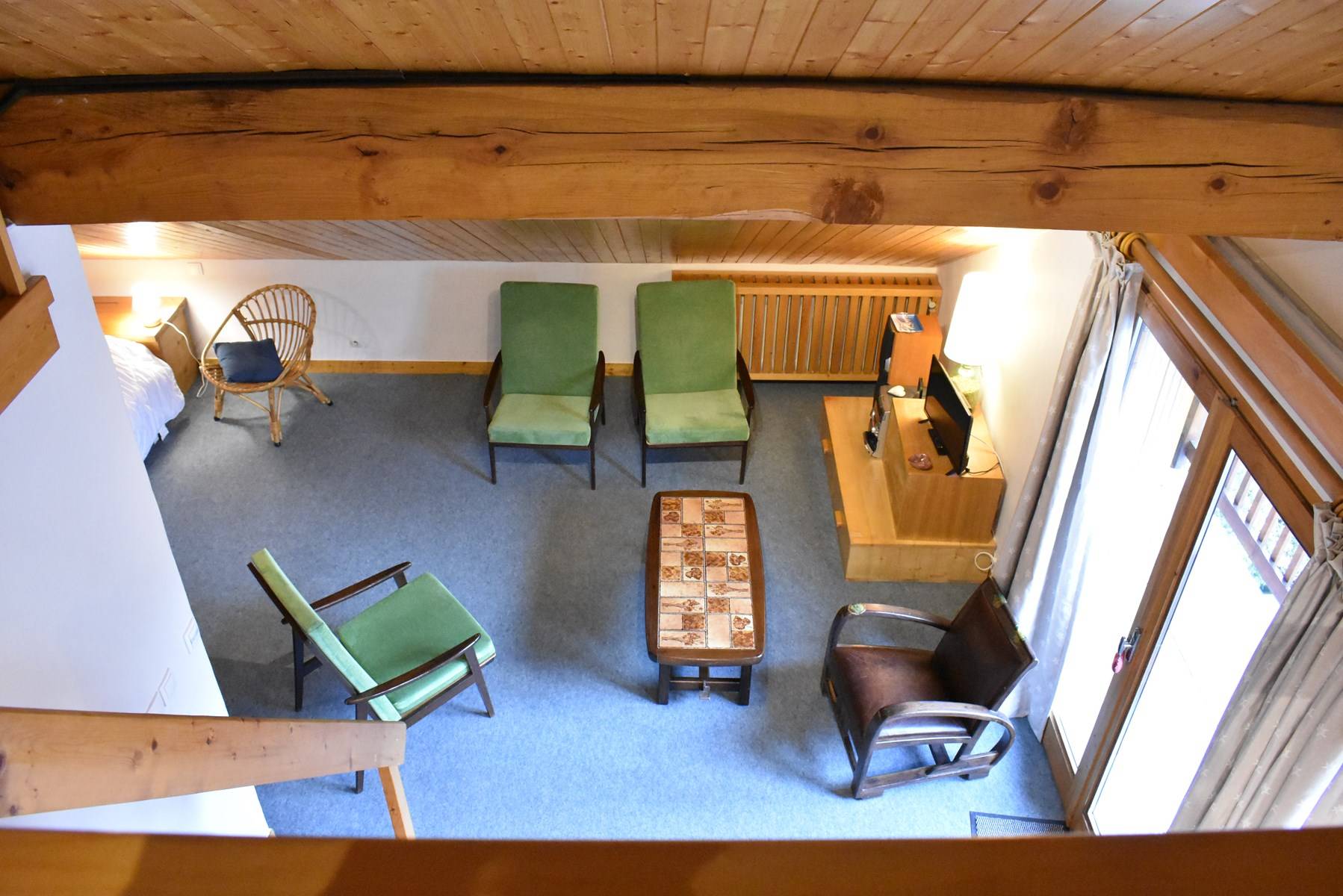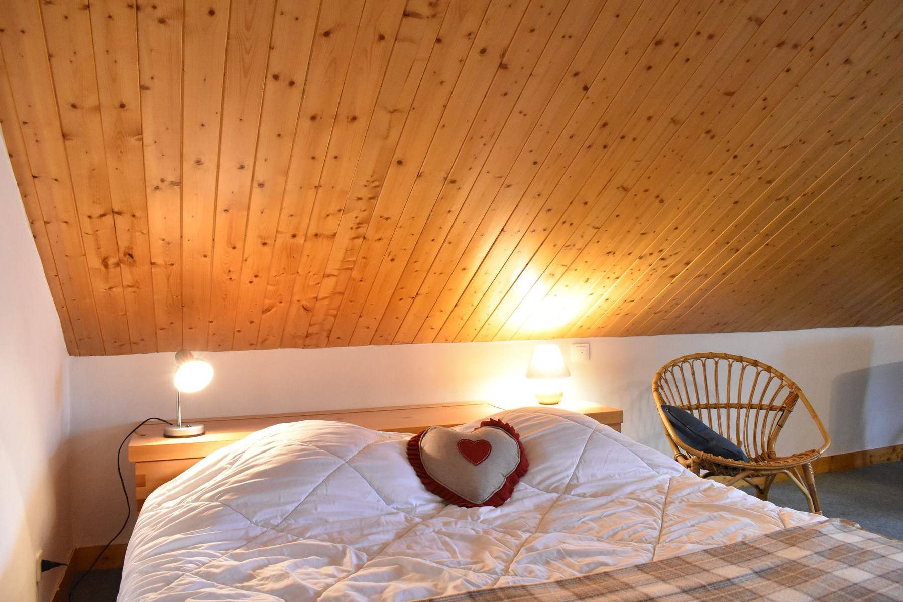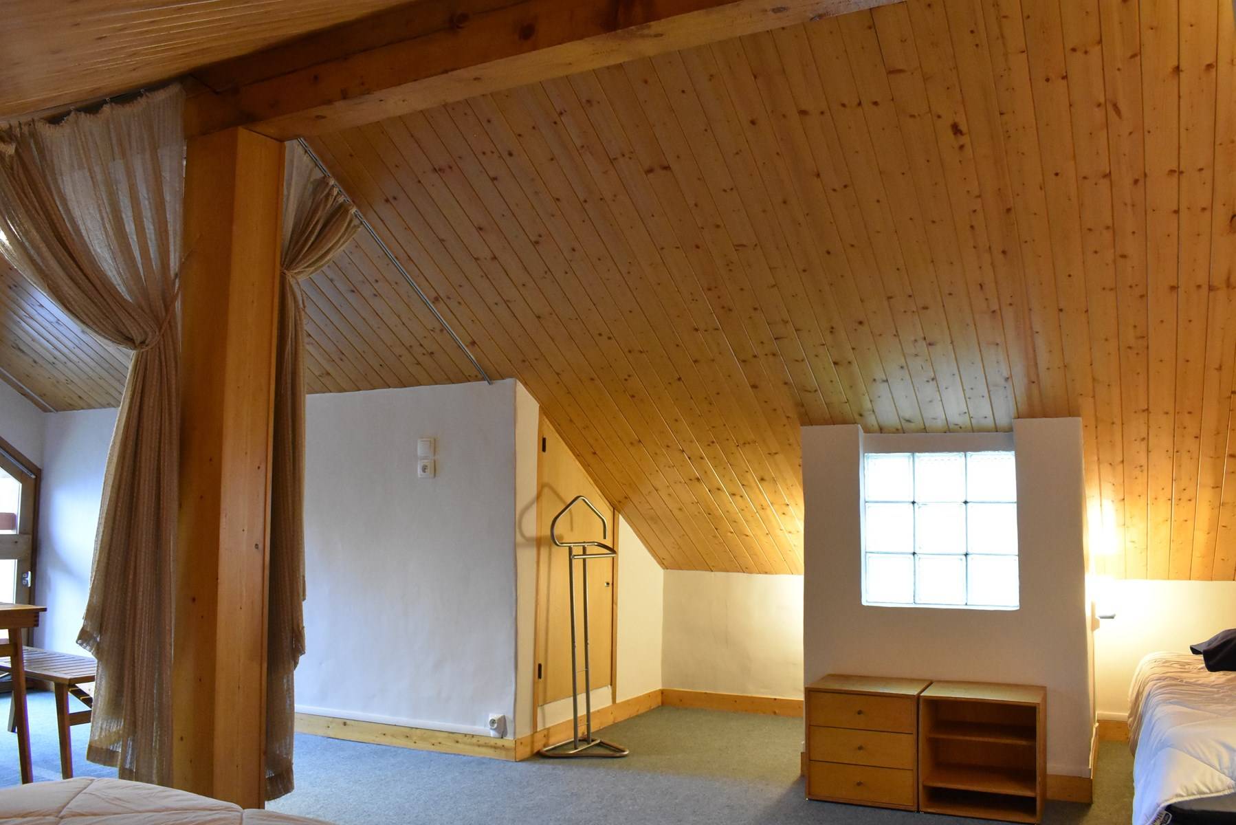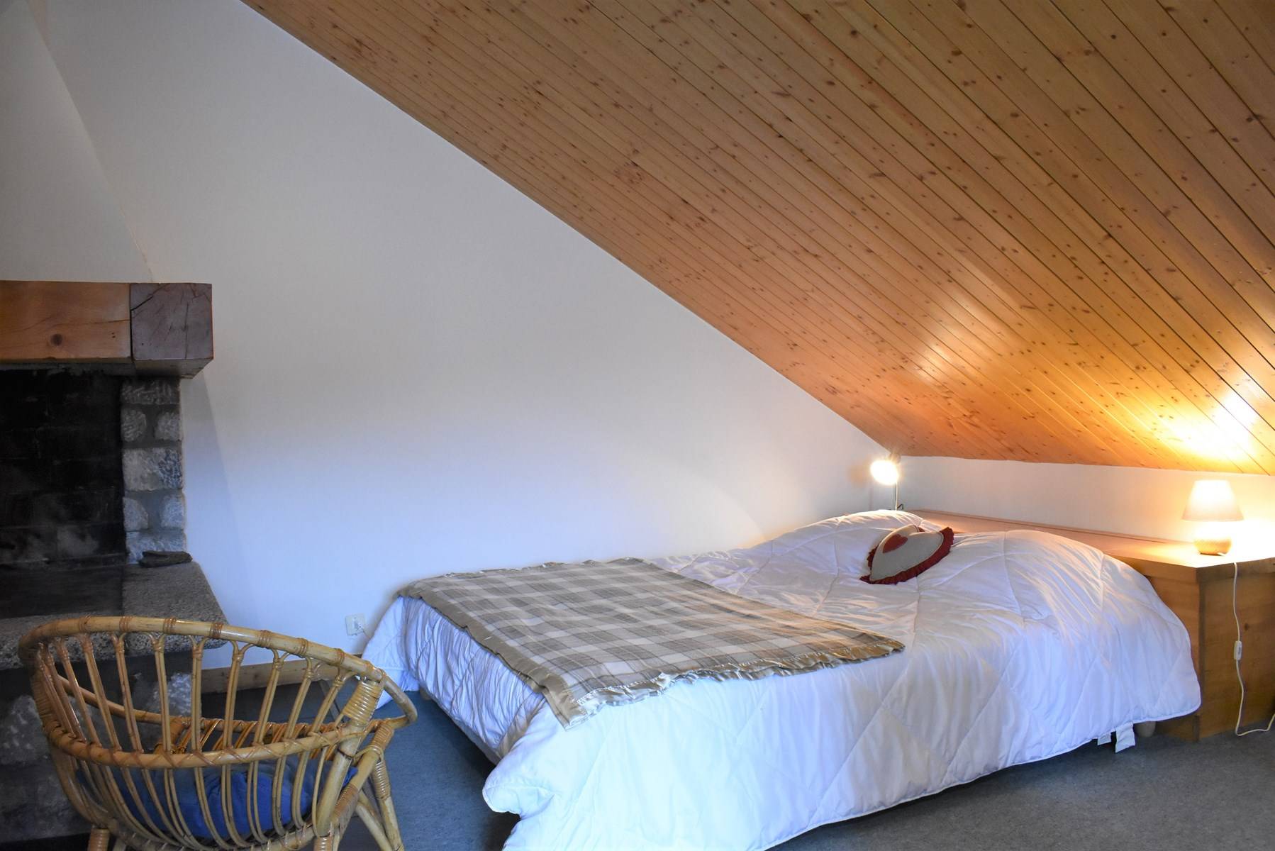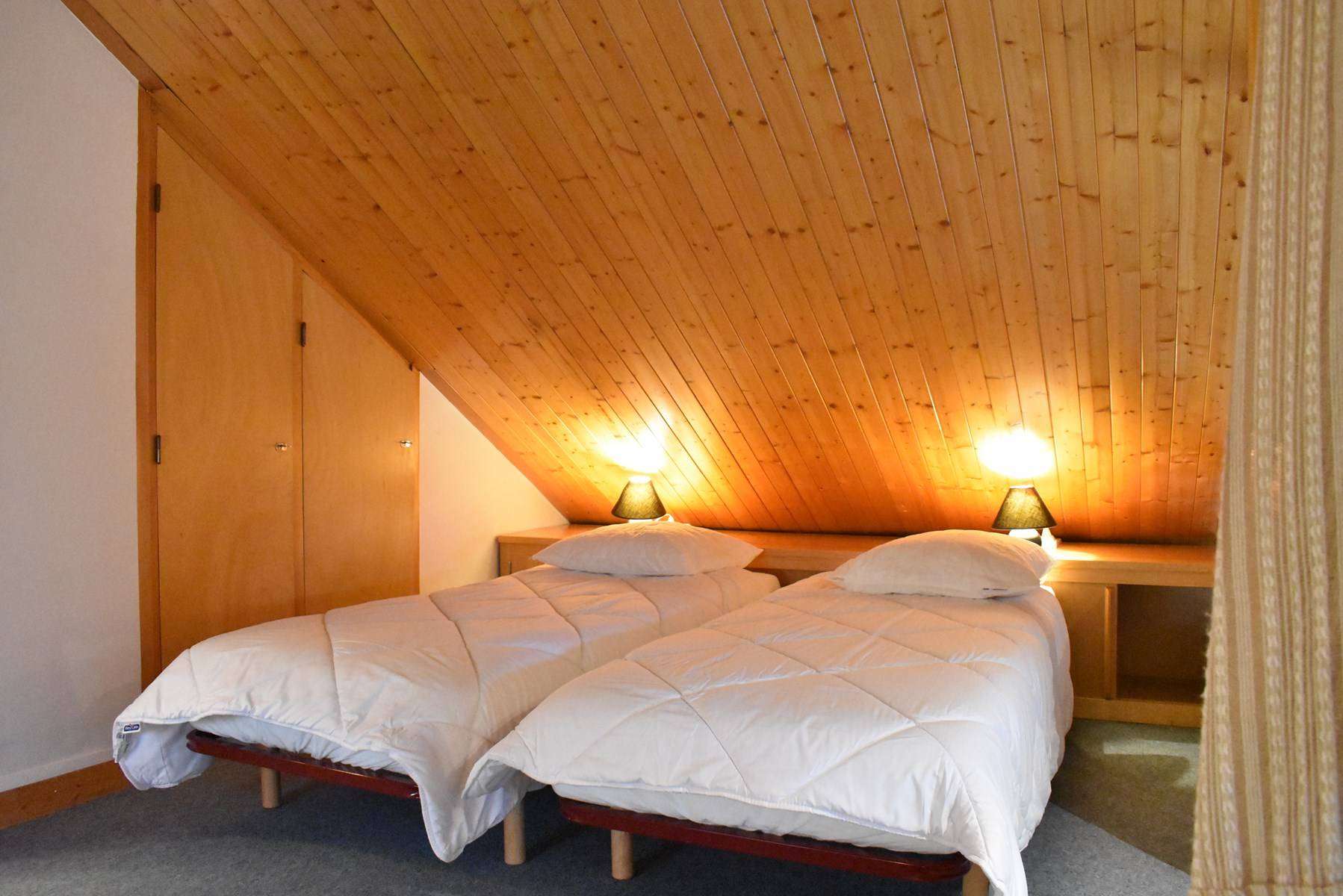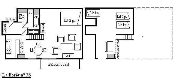 Cette location à la montagne, située au quatrième étage par ascenseur (+ 1 étage à pied), comprend une cuisine équipée donnant sur un séjour télévision (balcon ouest) avec 1 lit double, une salle de bain (lave-linge/sèche-linge), un wc indépendant; à l'étage, une mezzanine avec deux lits simples (80) et un lit simple (90), 1 casier à skis (RDC haut)