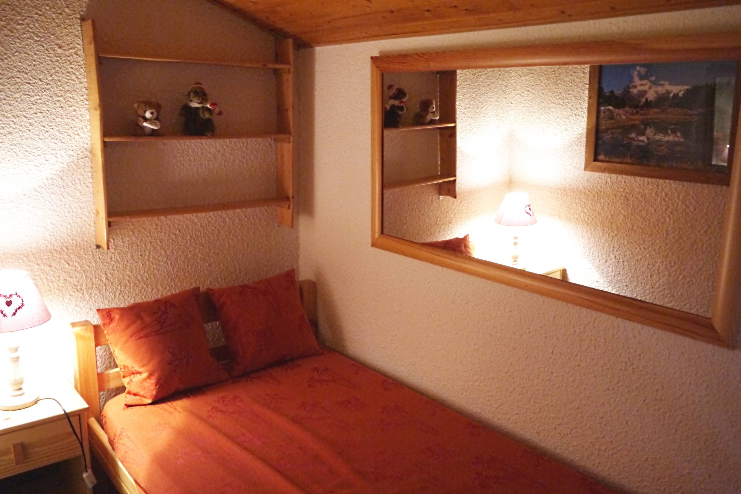 Séjour comprenant une banquette simple et télévision. Mezzanine ouverte sur l'escalier avec Salle de bain, coin couchage avec lit simple et lit tiroir et coin couchage avec lit simple.Cuisine équipée de plaques vitro, four, micro ondes, lave vaisselle, réfrigérateur, bouilloire, grille pain, cafetière Bosch Tassimo. Wc au rez-de-chaussée. Appartement non-fumeur. Animaux non admis. Balcon, casier à skis et ascenseur dans la résidence.