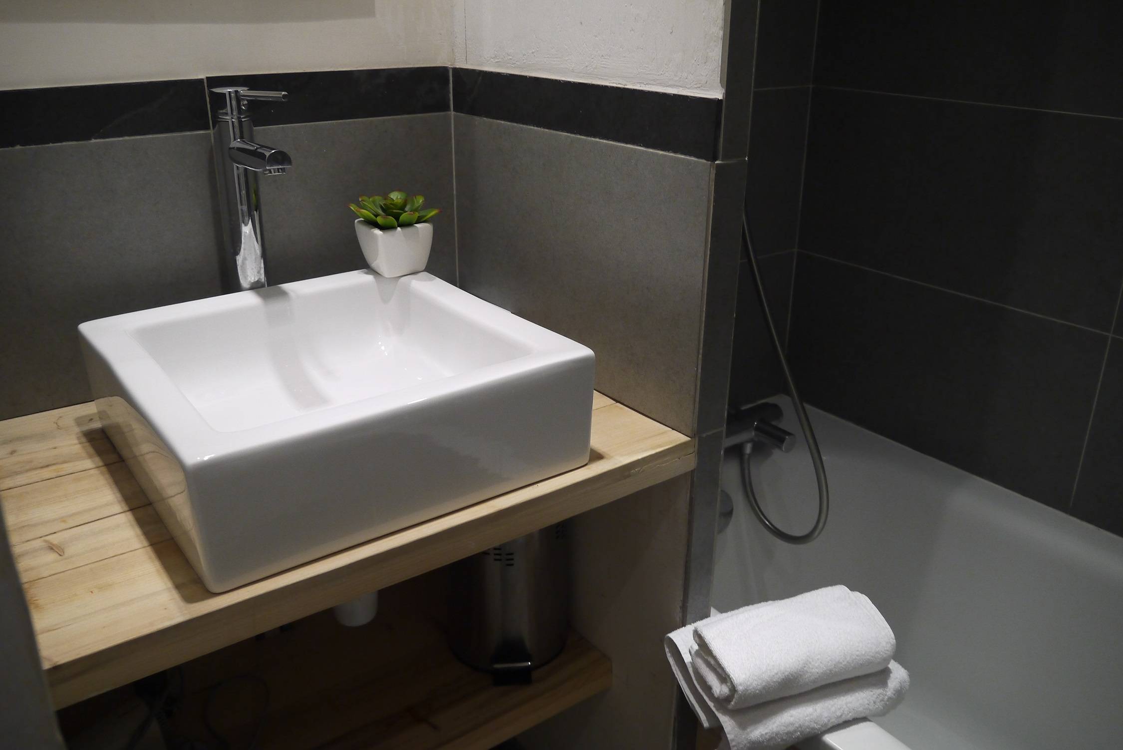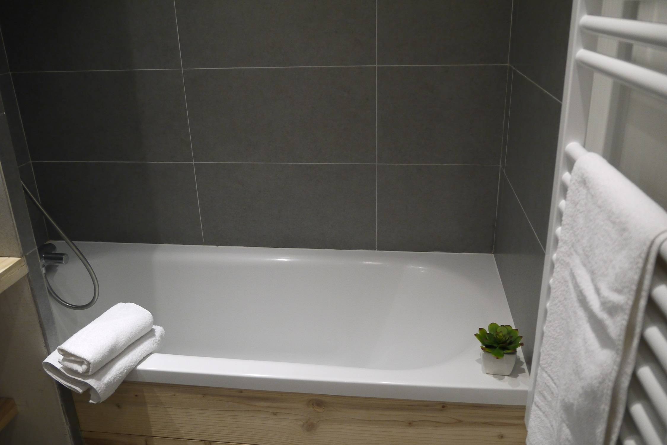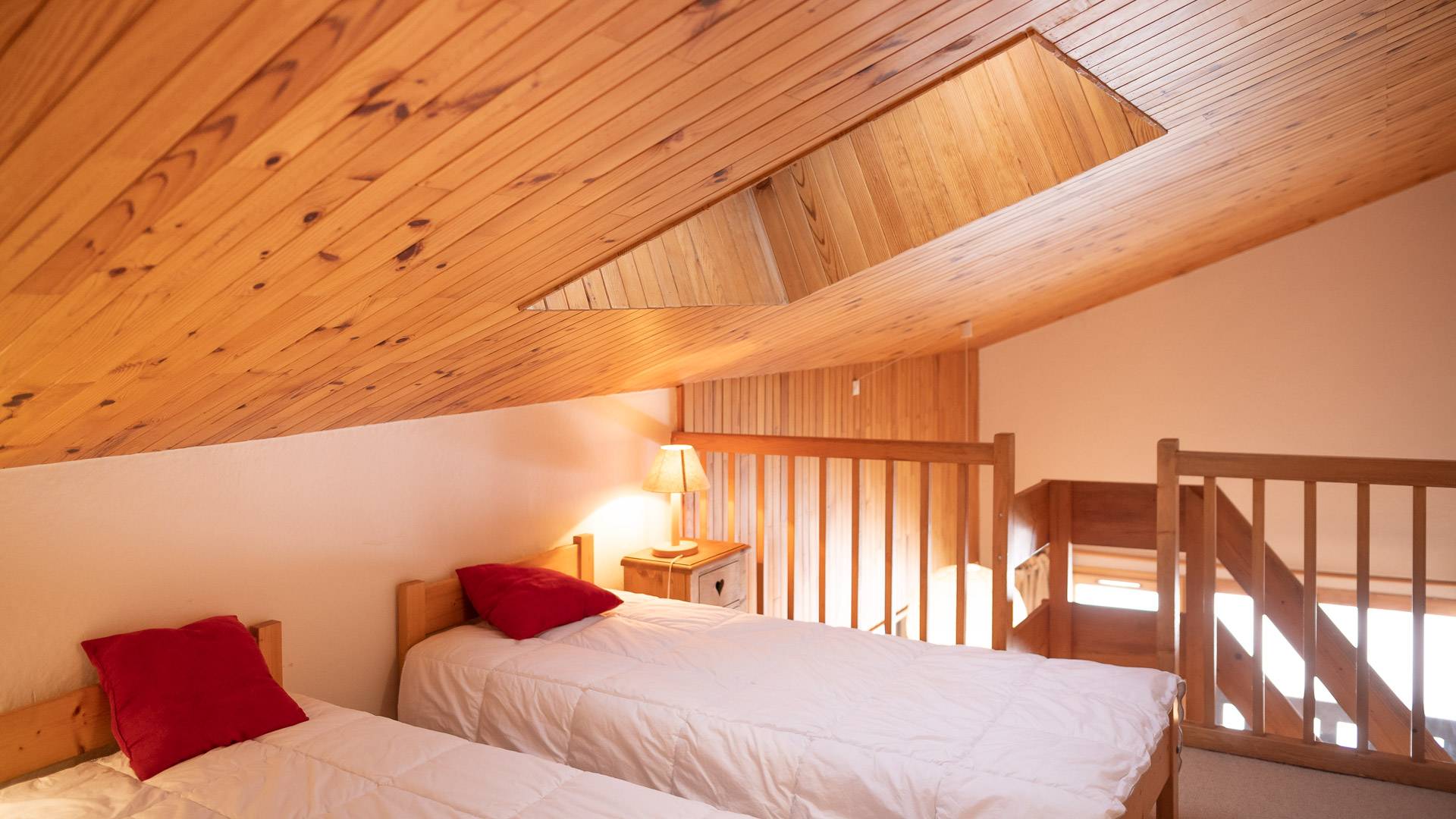 Séjour avec télévision, prolongé d'un balcon avec vue panoramique. Pas de couchages dans le séjour. Chambre avec lit double (140x190). Salle de bains et WC séparés. Cuisine américaine équipée de plaques vitrocéramique, four, lave-vaisselle, réfrigérateur, bouilloire, cafetière à filtre grille-pain. A l'étage, deux lits simples sur la mezzanine (80x190). Chambre mansardée contenant 2 lits simples et un lit tiroir (80x190). Salle de douche avec WC. Appartement non-fumeur. Animaux non admis. Casier à skis dans la résidence. 4ème étage.