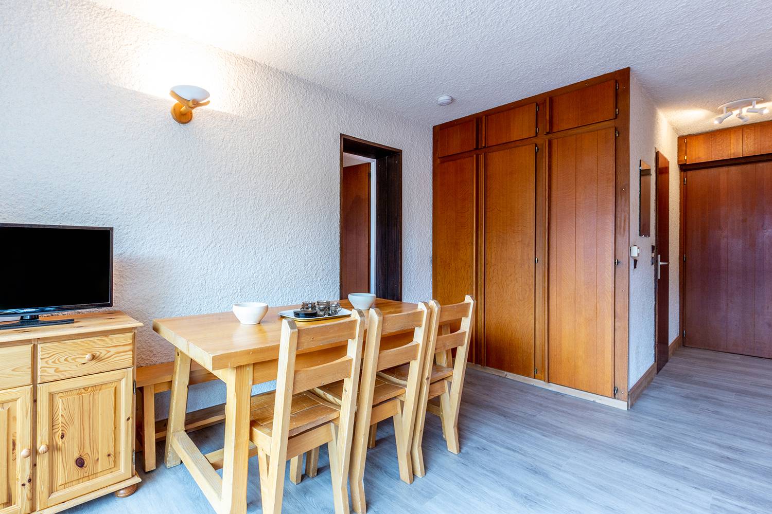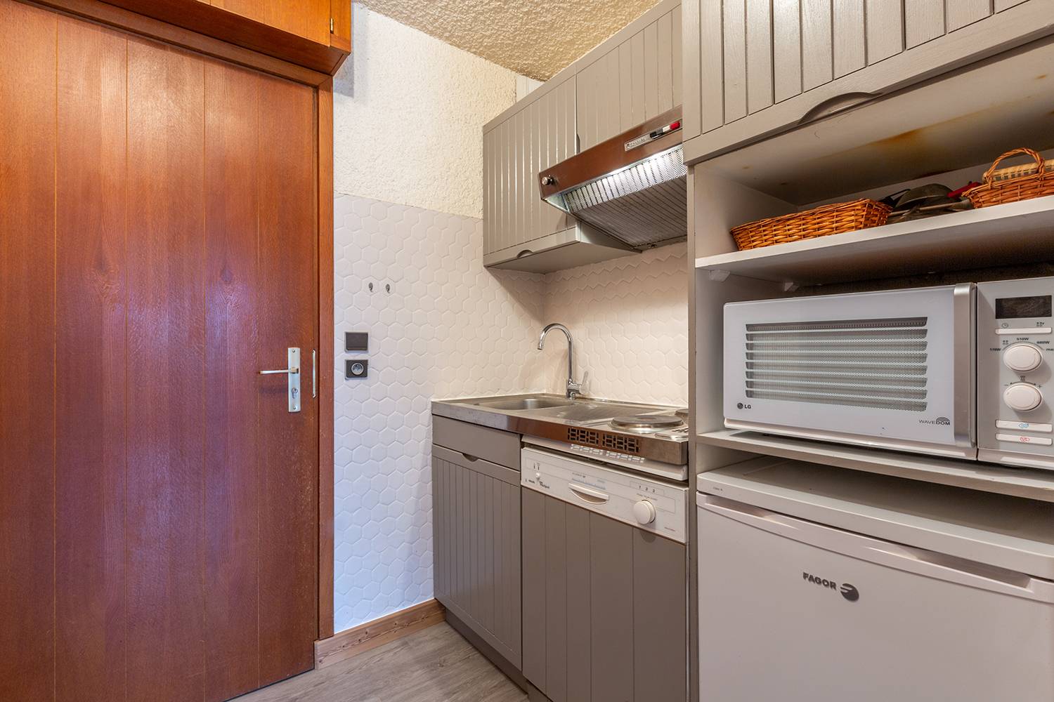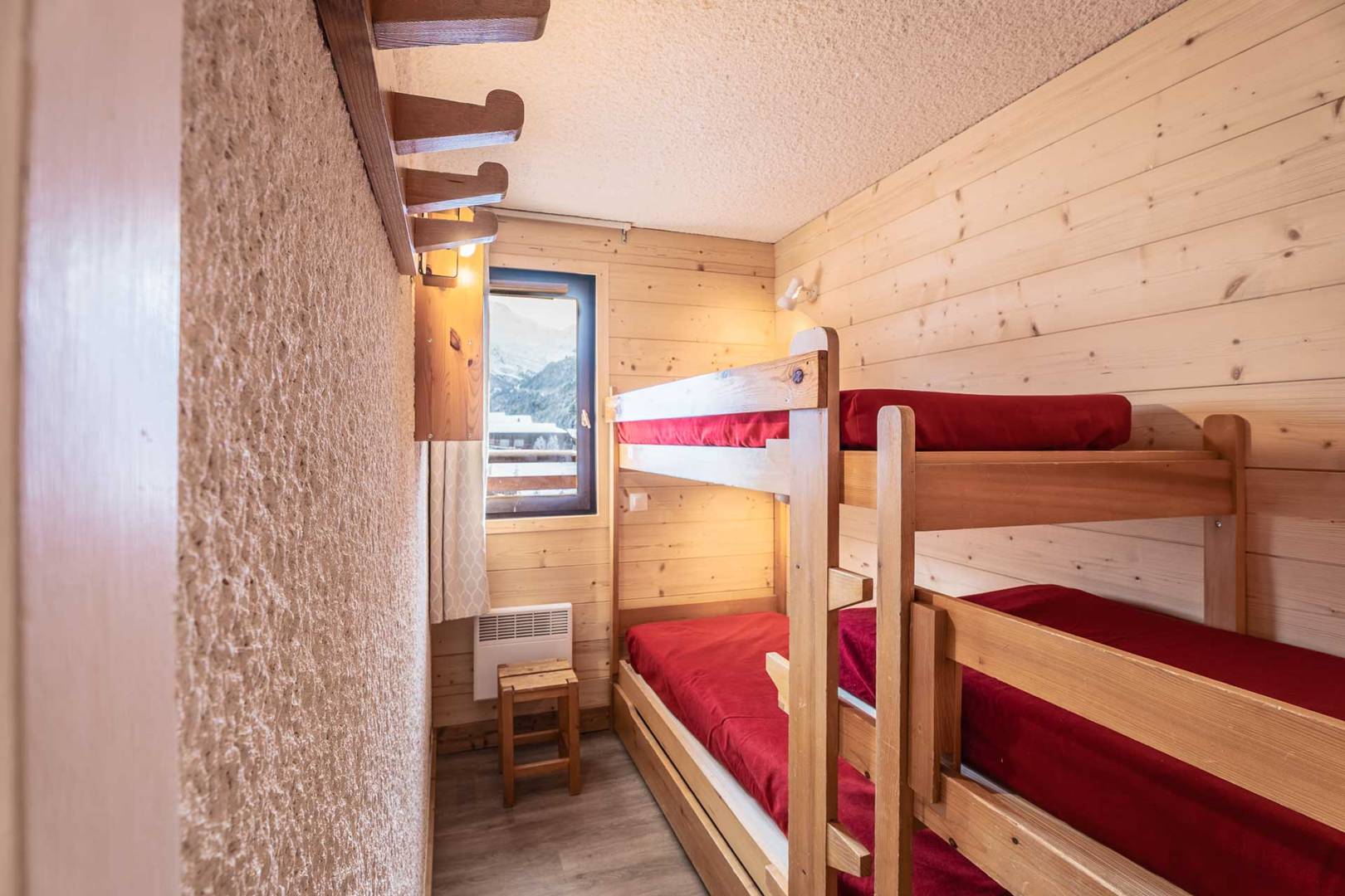 Séjour avec un canapé convertible (140x190) et télévision. Chambre composé de 3 couchages superposés (80x190). Kitchenette dans l'entrée équipée de plaques de cuisson, micro ondes, lave vaisselle, bouilloire, cafetière, grille-pain et réfrigérateur. Salle de bains avec wc. Balcon exposition sud. Appartement non-fumeur. Casier à skis et ascenseur dans la résidence. Situé au 3éme étage. Animaux non admis.