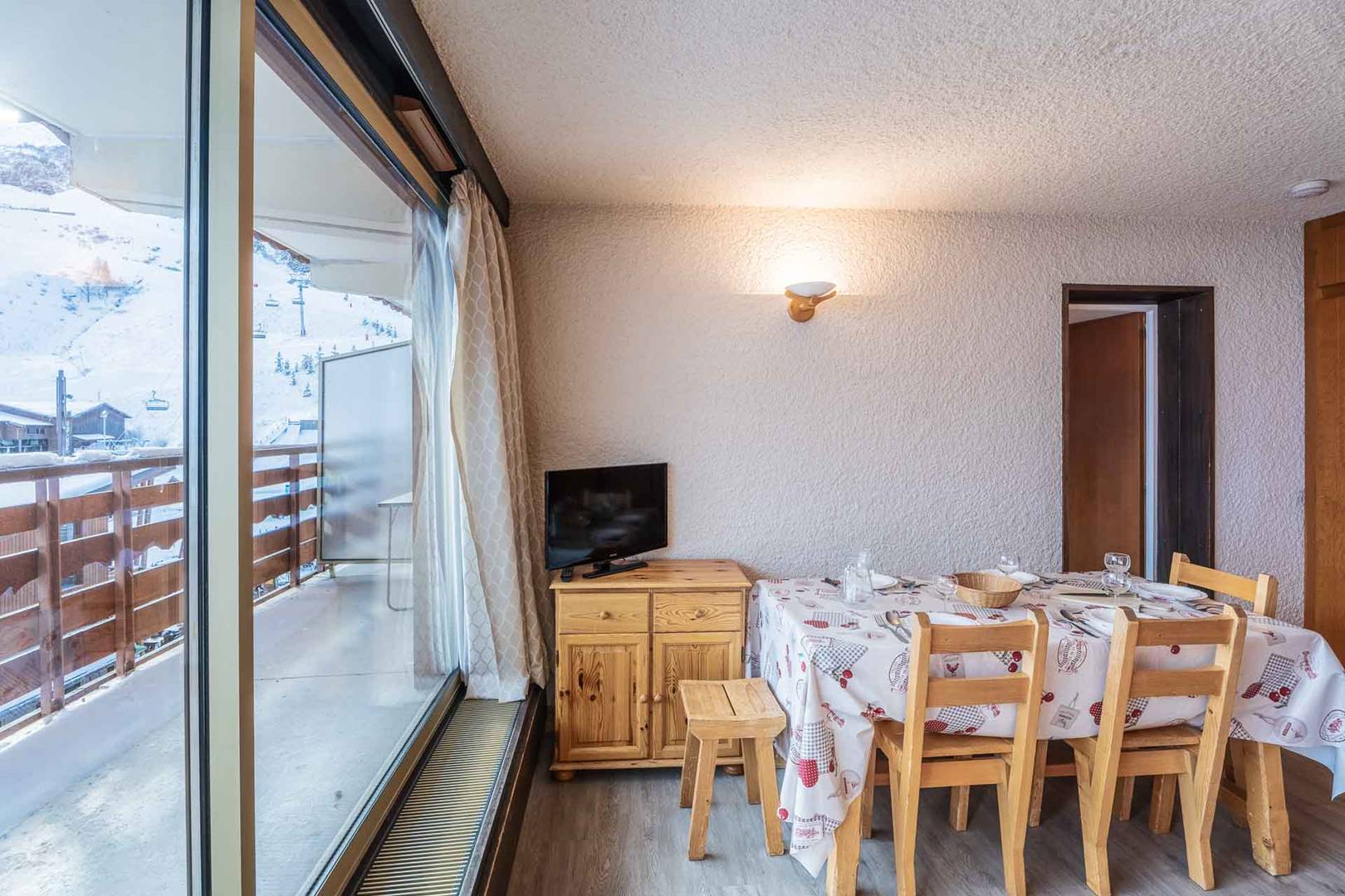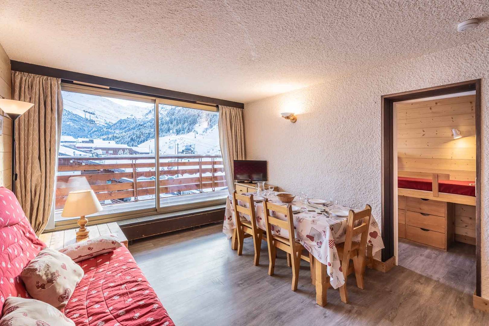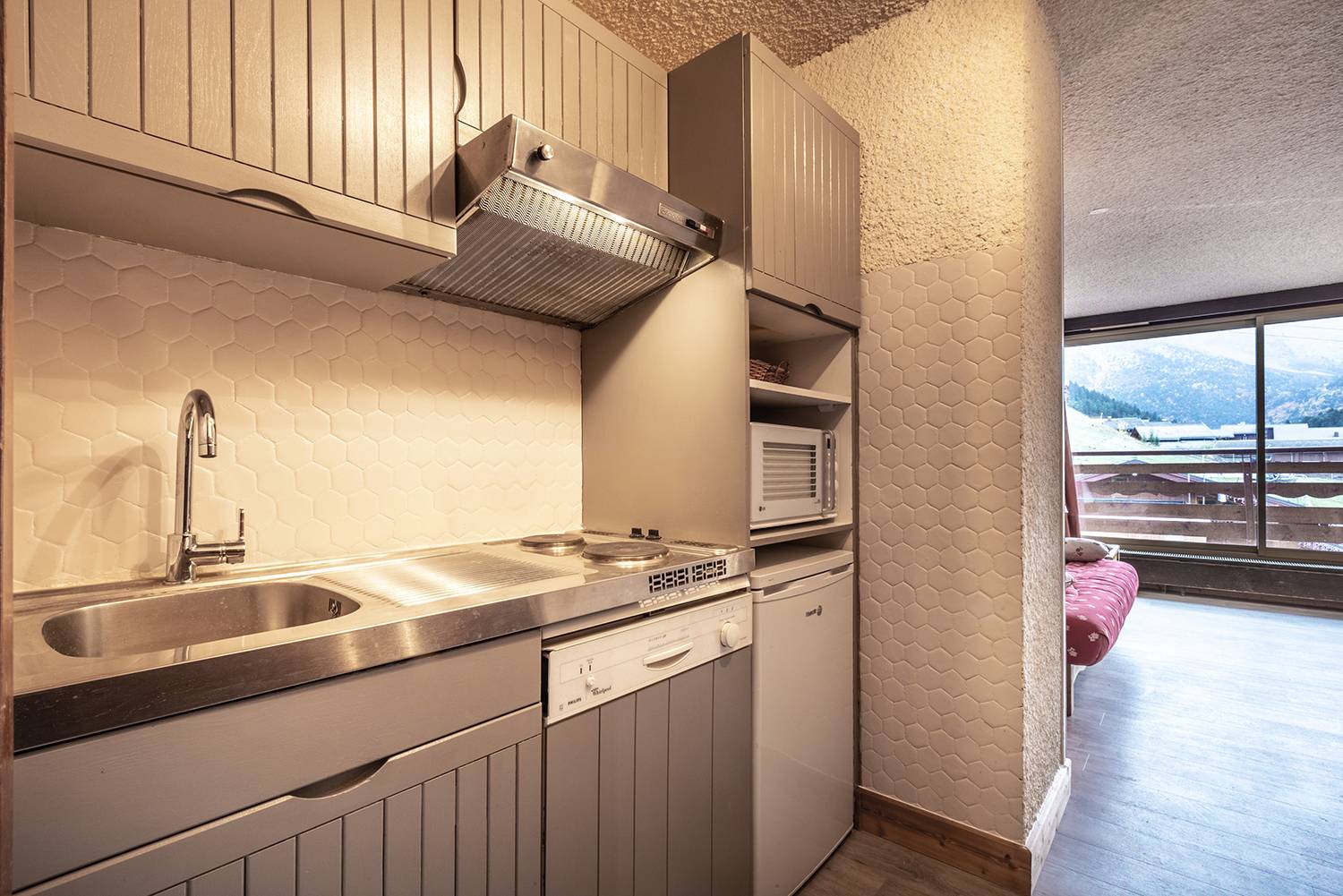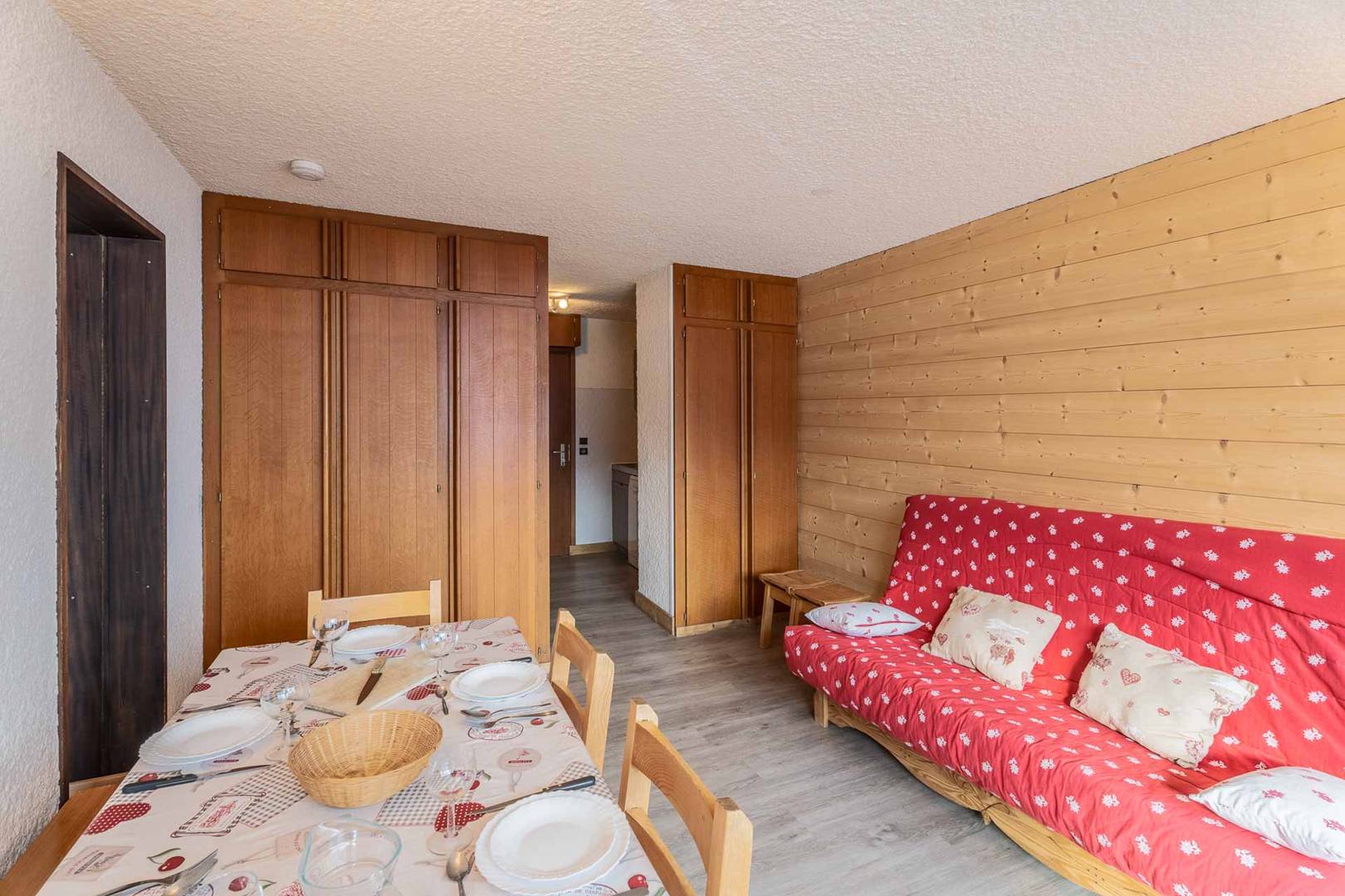Séjour avec un canapé convertible (140x190) et télévision. Chambre composé de 3 couchages superposés (80x190). Kitchenette dans l'entrée équipée de plaques de cuisson, micro ondes, lave vaisselle, bouilloire, cafetière, grille-pain et réfrigérateur. Salle de bains avec wc. Balcon exposition sud. Appartement non-fumeur. Casier à skis et ascenseur dans la résidence. Situé au 3éme étage. Animaux non admis.
