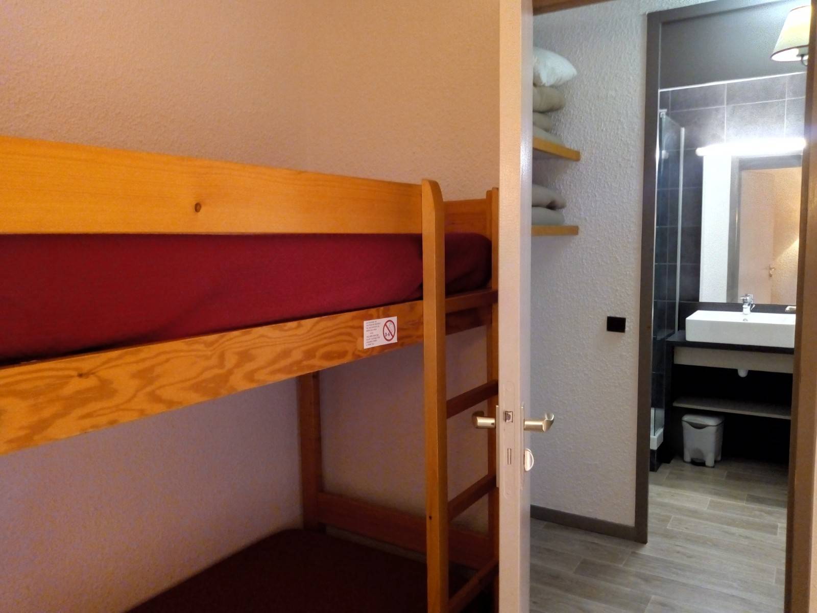 Séjour divisible avec 2 banquettes lit (80x190), coin repas. Salle de bains et wc séparés. Cuisine équipée de plaques vitrocéramique, four micro-ondes, lave vaisselle, réfrigérateur, bouilloire, grille-pain, cafetière. Dans la mezzanine se trouve un ensemble de lits superposés (80x190). Une chambre mansardée avec 1 lit double (160x190). Salle de douche avec WC. Balcon. Casier à skis et ascenseur dans la résidence. 3ème étage. Appartement non fumeur / Animaux non admis