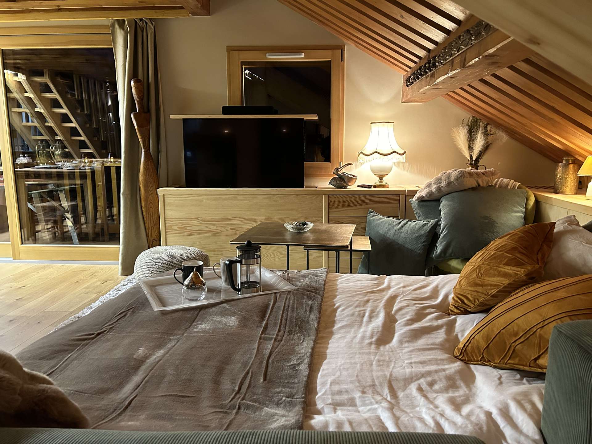 La résidence La Gélinotte vous offre une situation idéale pour des vacances à la montagne : les pistes sont au pied de l'immeuble, avec un casier à skis individuel par appartement. Vous êtes à moins de 100m des commerces et restaurants, à seulement 100m de l'arrêt navette gratuite, et à 2 km du centre de la station. Cet appartement, situé au 4ème étage avec ascenseur, propose un espace qui allie qualité, confort et originalité. Il dispose d'une cuisine entièrement équipée, d'un séjour spacieux et décoré avec goût, télévision dernière génération, ainsi que d'un coin repas donnant sur un balcon exposé plein sud, vous offrant une vue panoramique, sans vis à vis. Il peut accueillir jusqu'à 7 personnes. Vous disposez d'une mezzanine avec un lit simple (90x200), d'une chambre avec un lit double (180x200) avec balcon privatif, une chambre avec 2 lits simples (90x200) avec sa salle de bain attenante équipée d'une baignoire sabot et un canapé convertible d'appoint (140x200) dans le séjour. Dans l'entrée vous découvrirez une salle de bain indépendante avec WC et un WC séparé. Le wifi est inclus.