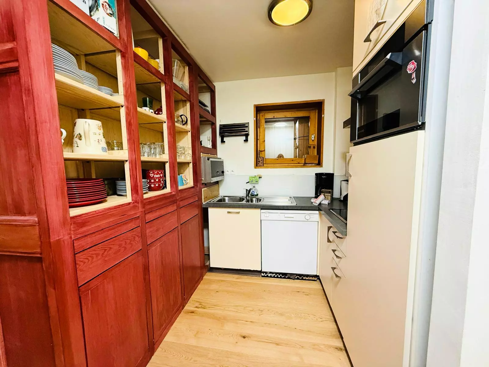 Cuisine fermée équipée : 4 plaques électriques, réfrigérateur, lave-vaisselle, micro-ondes, bouilloire, hotte, machine à café