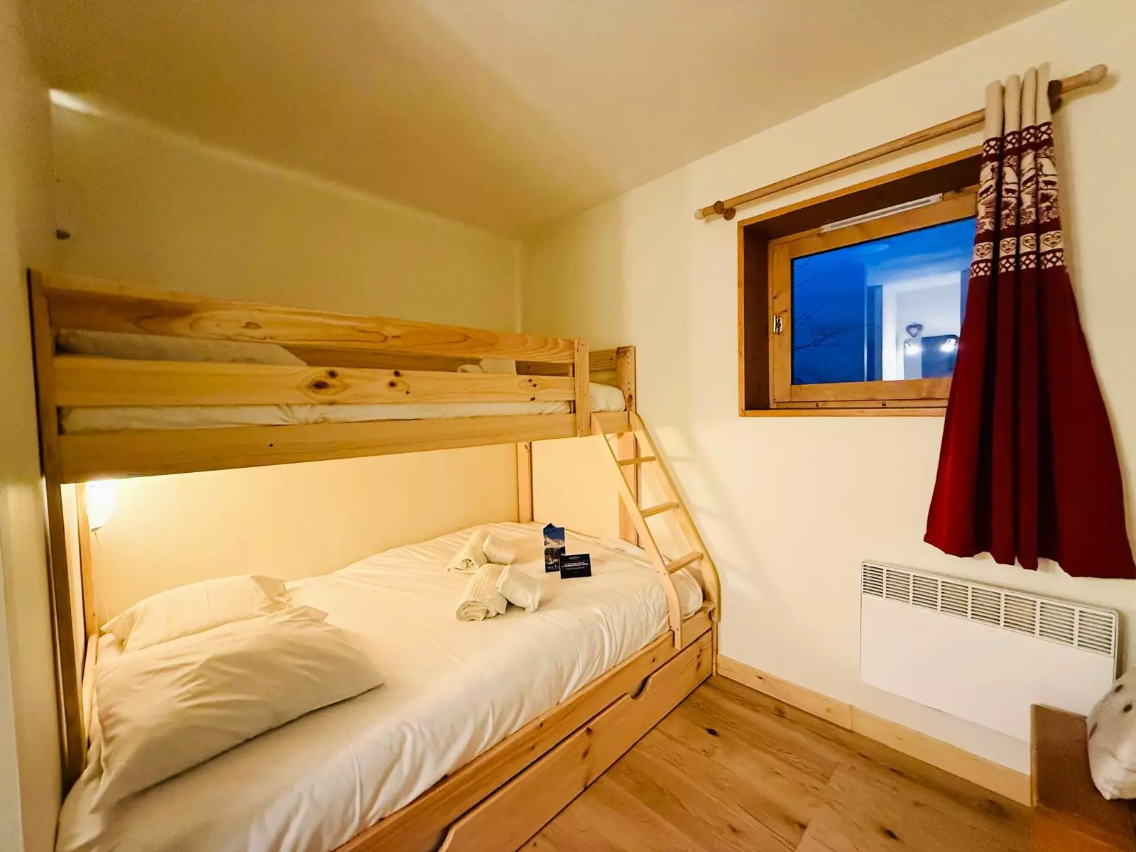 Chambre enfants : 2 lits superposés (lit du bas 140x190, lit du haut 90x190) avec lavabo dans la chambre