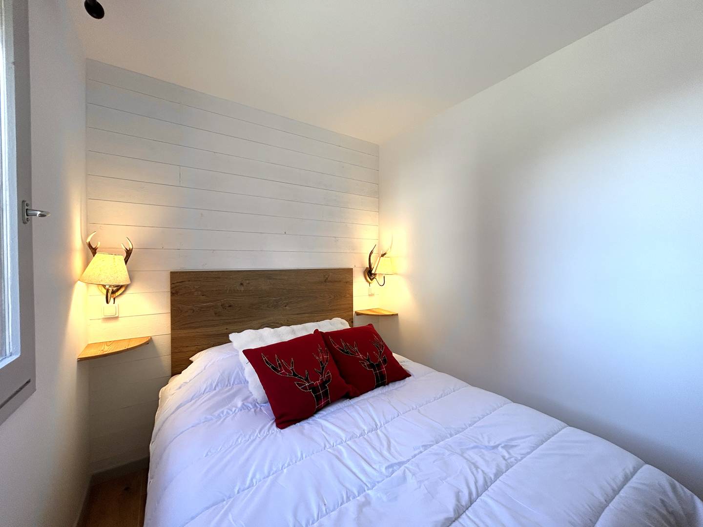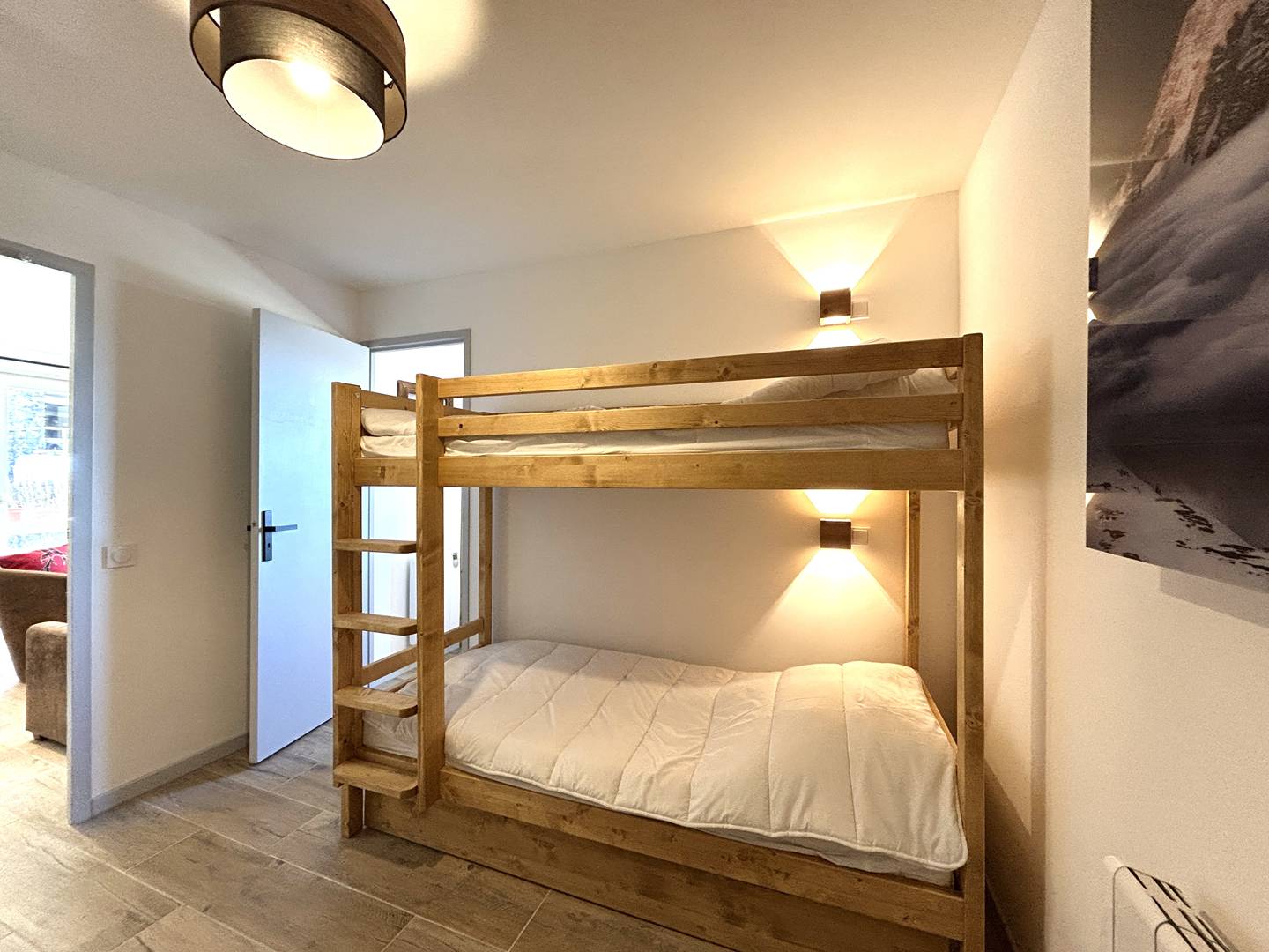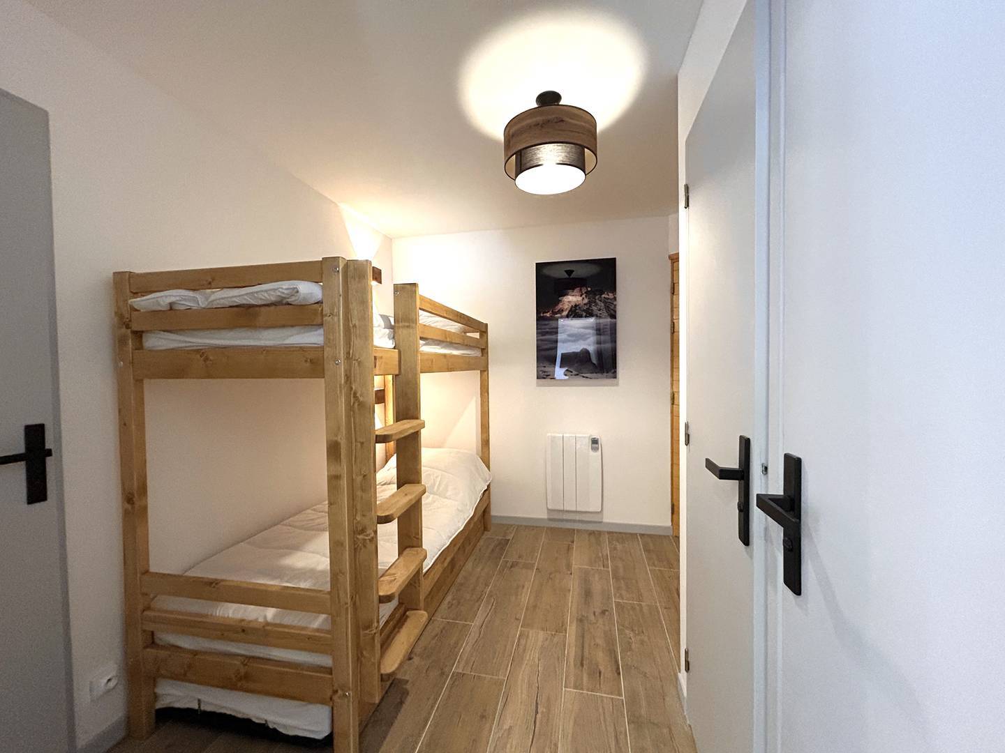 Côté nuit, la chambre principale dispose d’un lit coffre double (140×190) et d’une armoire, offrant de larges possibilités de rangement. Le coin montagne, aménagé dans le prolongement de l’entrée, peut être totalement fermé du séjour pour plus d’intimité. Il accueille trois couchages (lits superposés et lit tiroir – 3 lits simples 80×190), constituant ainsi une seconde chambre à part entière.