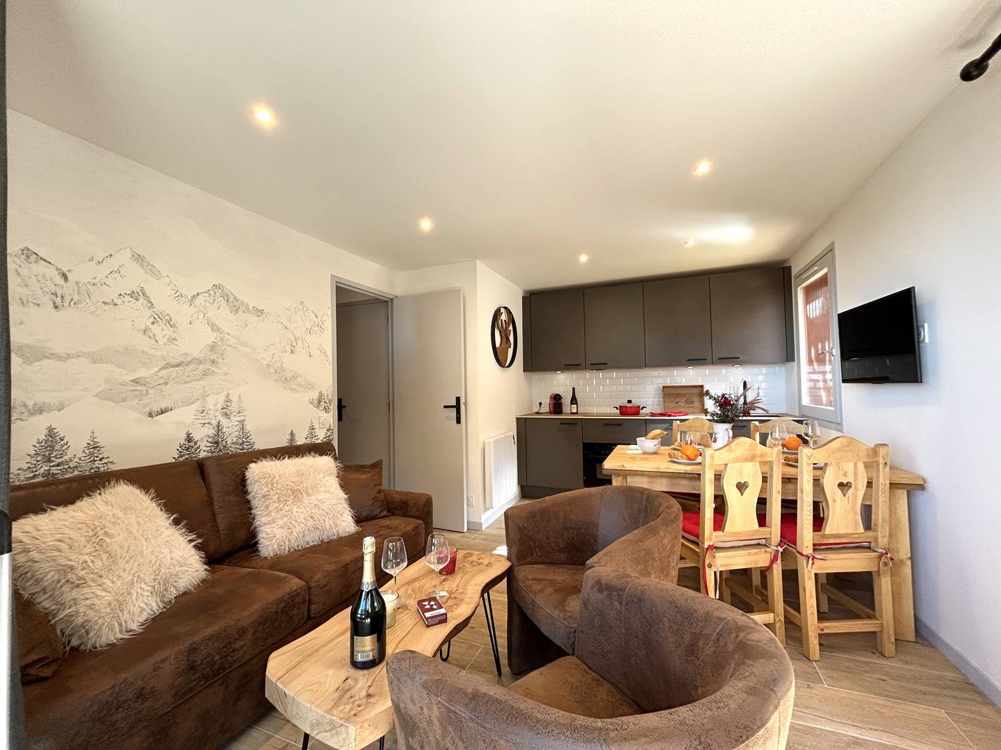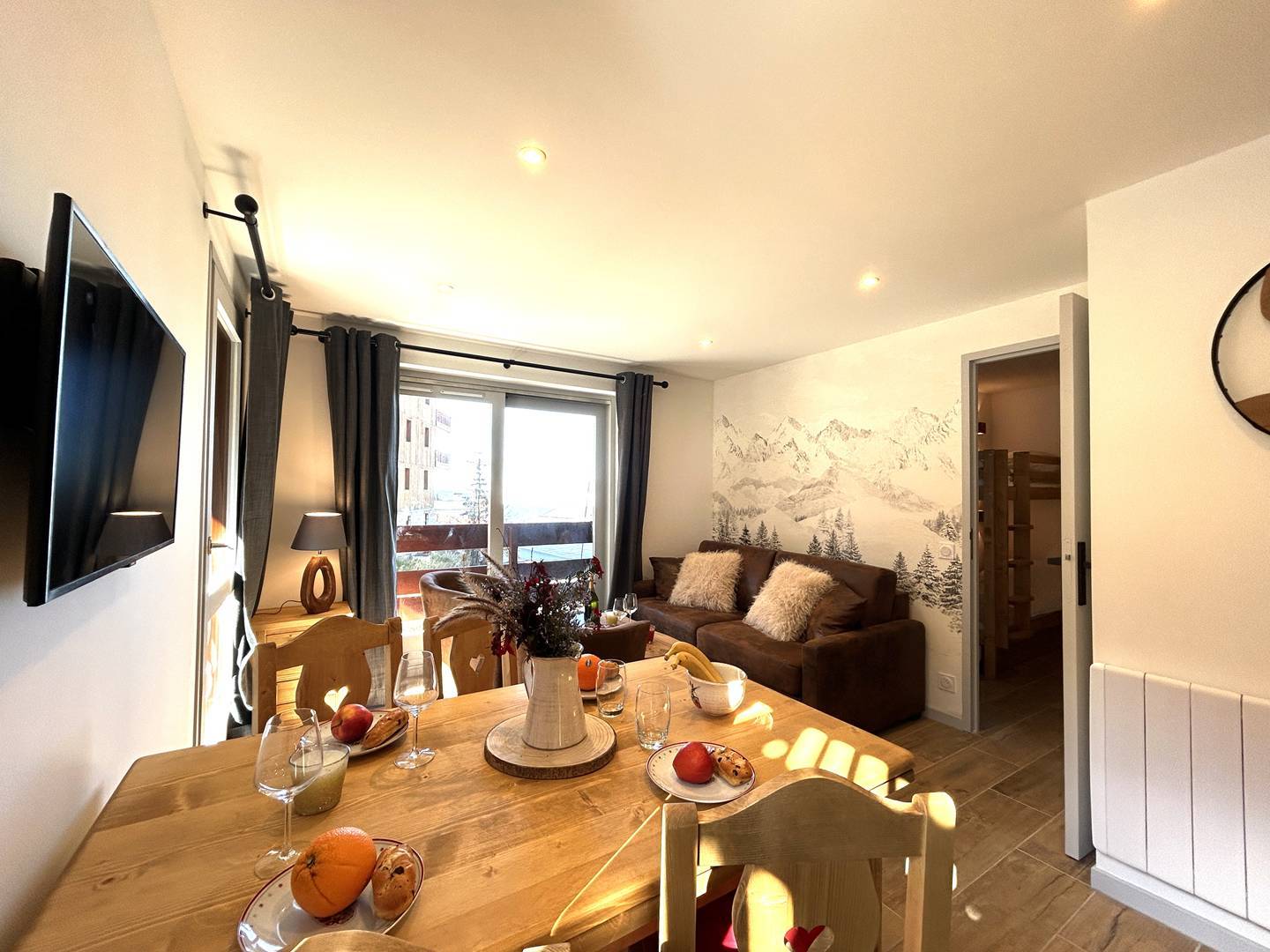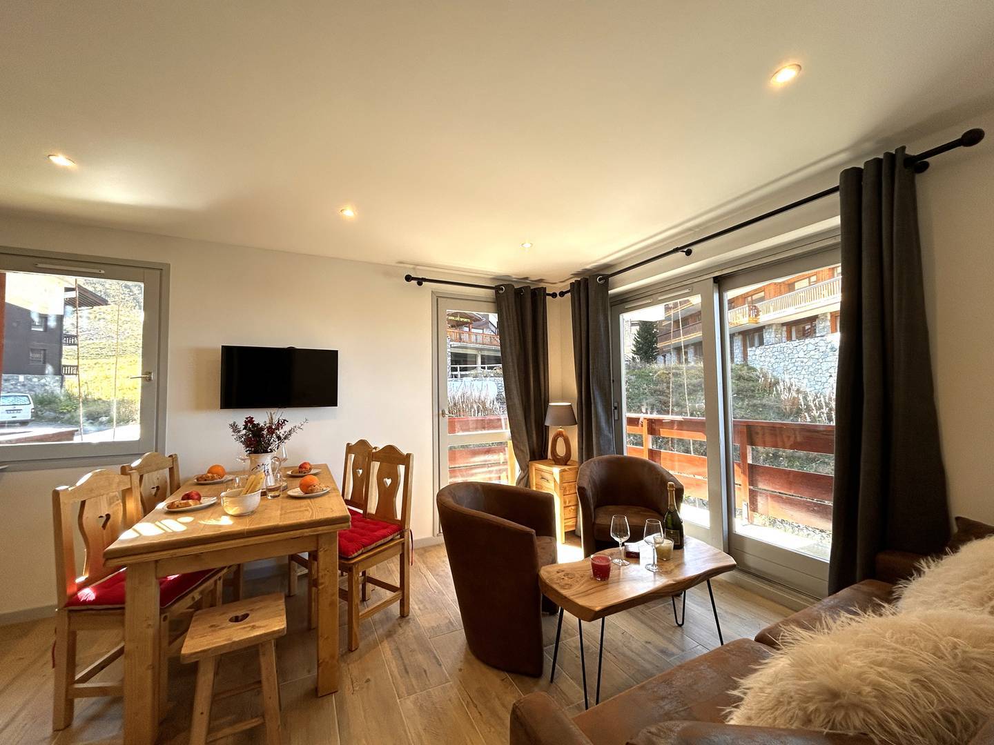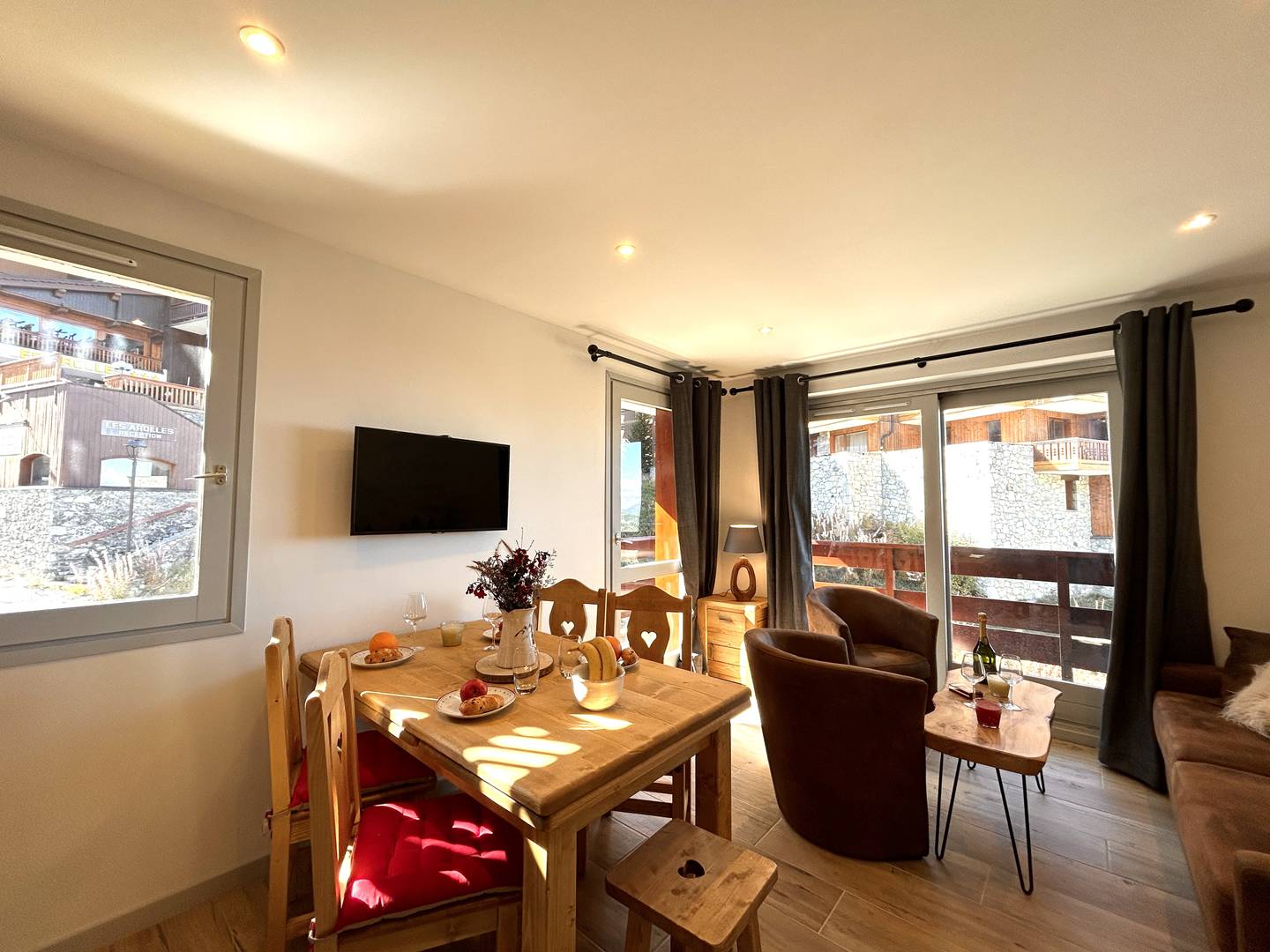 Le séjour en angle, sans couchage, profite de grandes ouvertures donnant sur deux larges balcons, offrant une impression d’espace et de clarté rare à la montagne.
