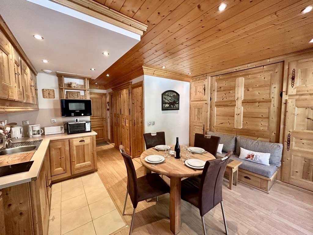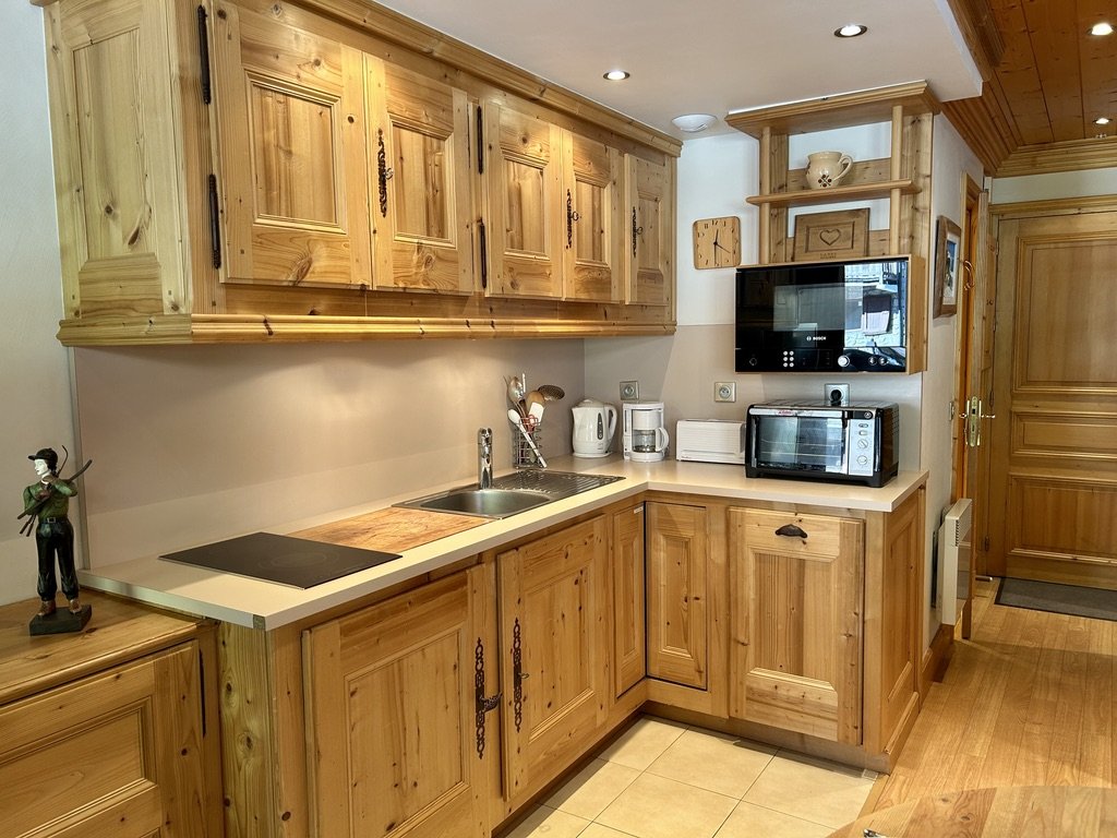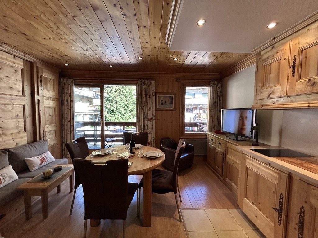 Il se compose d'une pièce à vivre très chaleureuse et lumineuse avec une cuisine équipée et ouverte sur le séjour avec sa télévision, son coin repas et sa banquette se transformant le soir en couchage très confortable, lit abattant 140x190 et donnant sur un balcon Est.
