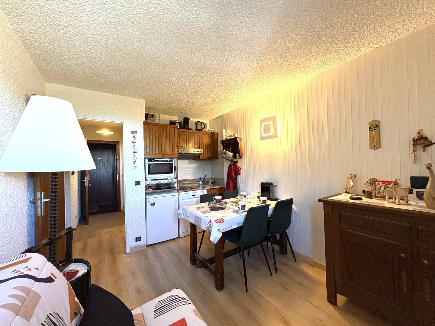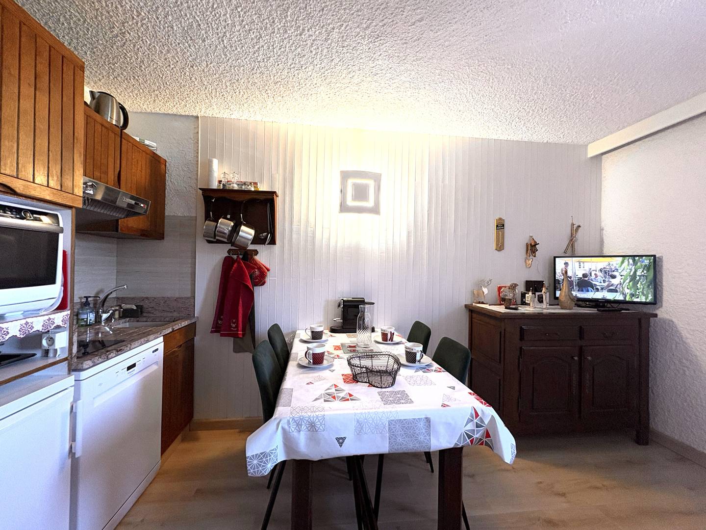 La kitchenette ouverte est fonctionnelle et bien équipée : 2 plaques vitrocéramique, four micro-ondes combiné, lave-vaisselle et réfrigérateur avec petit compartiment congélateur.