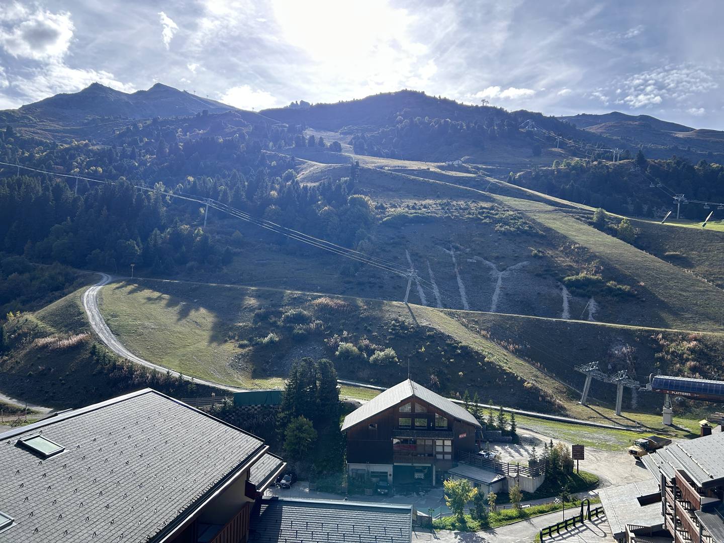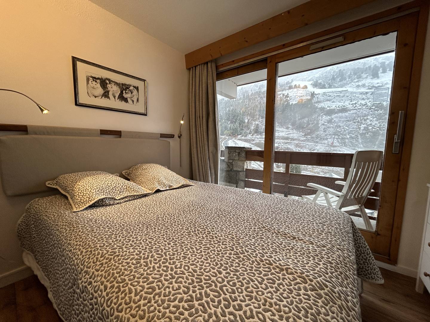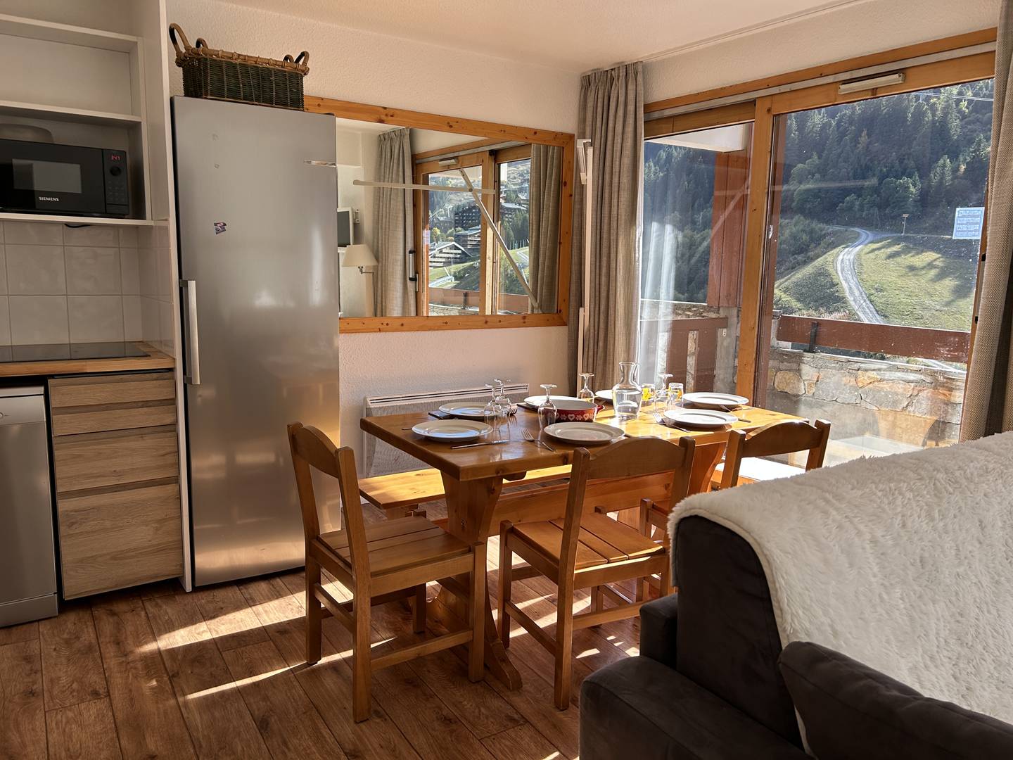 La pièce de vie spacieuse et lumineuse est le véritable cœur du logement : cuisine ouverte, espace repas convivial et coin détente confortable, sans couchage, offrant une atmosphère chaleureuse. De larges baies vitrées permettent de profiter d’une vue panoramique dégagée sur les pistes.