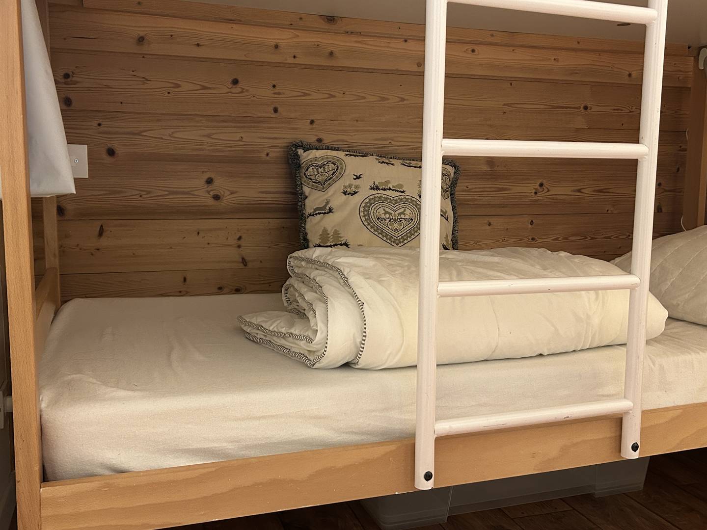Une chambre avec trois couchages (lit double 130x190 + lit superposé 90x190) donnant et une chambre avec lit double (sur coursive toutes les deux), une chambre cabine avec un lit simple (sans fenêtre ouverte par une verrière donnant sur la chambre parentale) une quatrième chambre avec lit double et accès balcon.