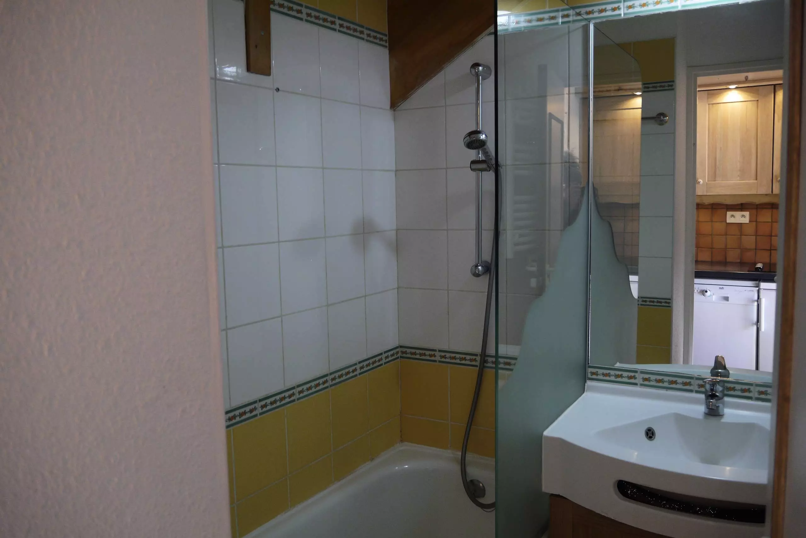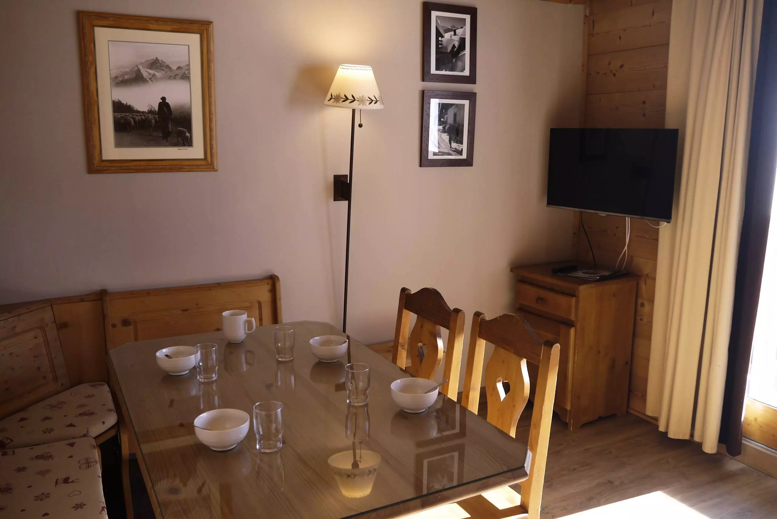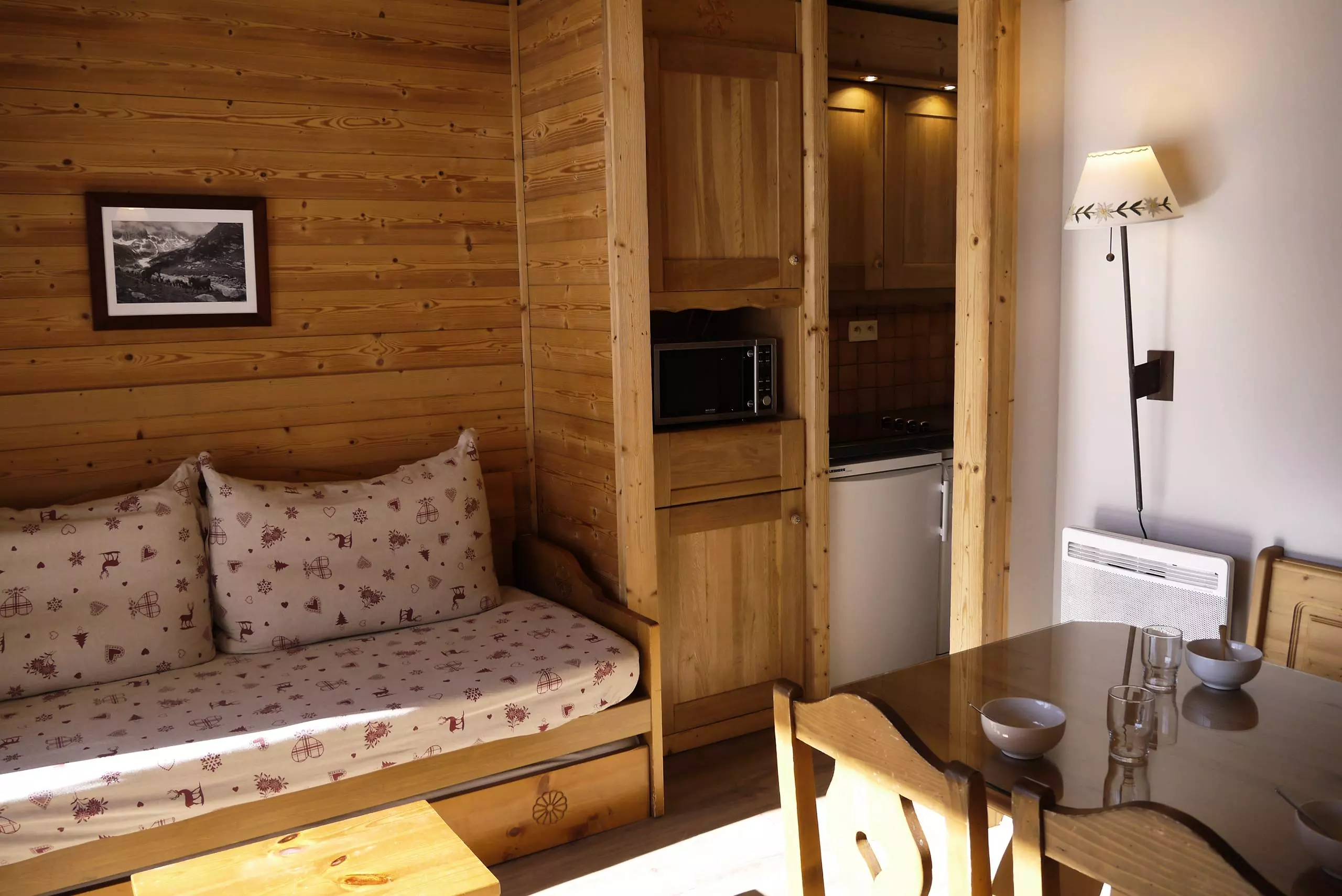 Le séjour avec balcon orienté Sud contient une banquette lit, un lit gigogne (90x190), la télévision. Chambre cabine avec un ensemble de lits superposés (80x190). Kitchenette équipée de plaques vitrocéramiques, four mixte, lave vaisselle et réfrigérateur. Salle de bains et wc séparés.