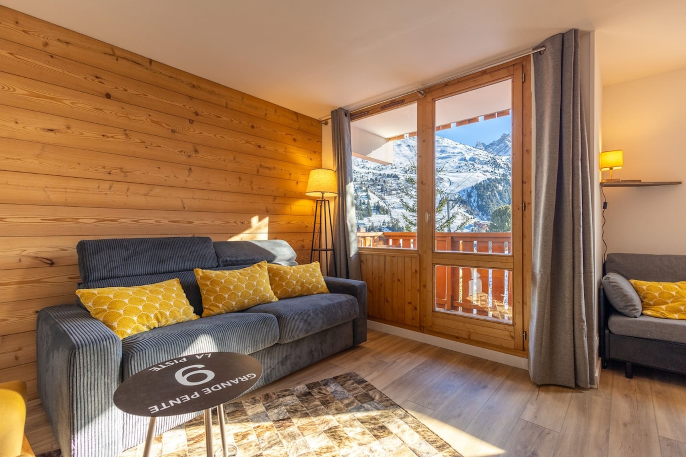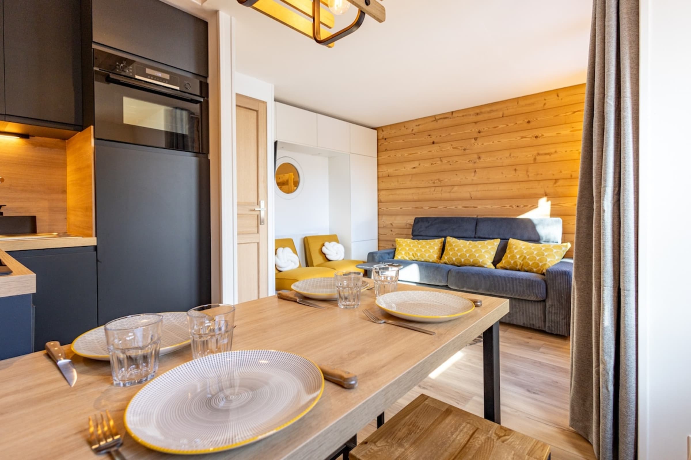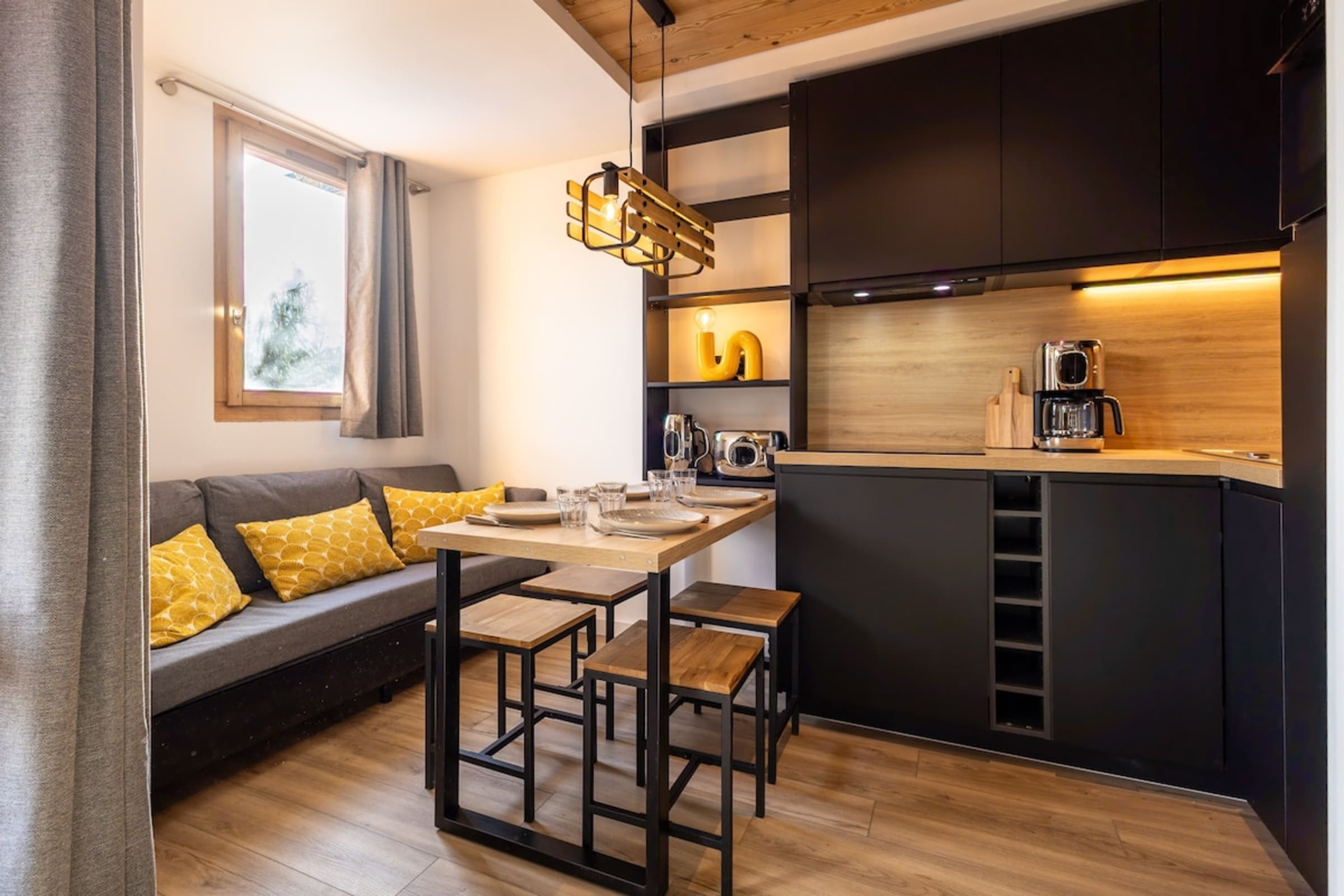 Ce cosy appartement de 28m² est parfait pour un séjour à la montagne, offrant un cadre chic et chaleureux. Il peut accueillir jusqu’à 5 personnes, avec une chambre équipée de deux lits superposés (adaptés aux adultes) et un lit gigogne, ainsi qu’un salon avec un canapé convertible confortable. Vous apprécierez également le balcon avec une vue imprenable sur les pistes et les montagnes environnantes. La salle de bain moderne et les équipements neufs garantiront votre confort. Un casier à ski est à votre disposition pour faciliter vos journées sur les pistes. Cet appartement bénéficie d’un emplacement privilégié au cœur des Trois Vallées.