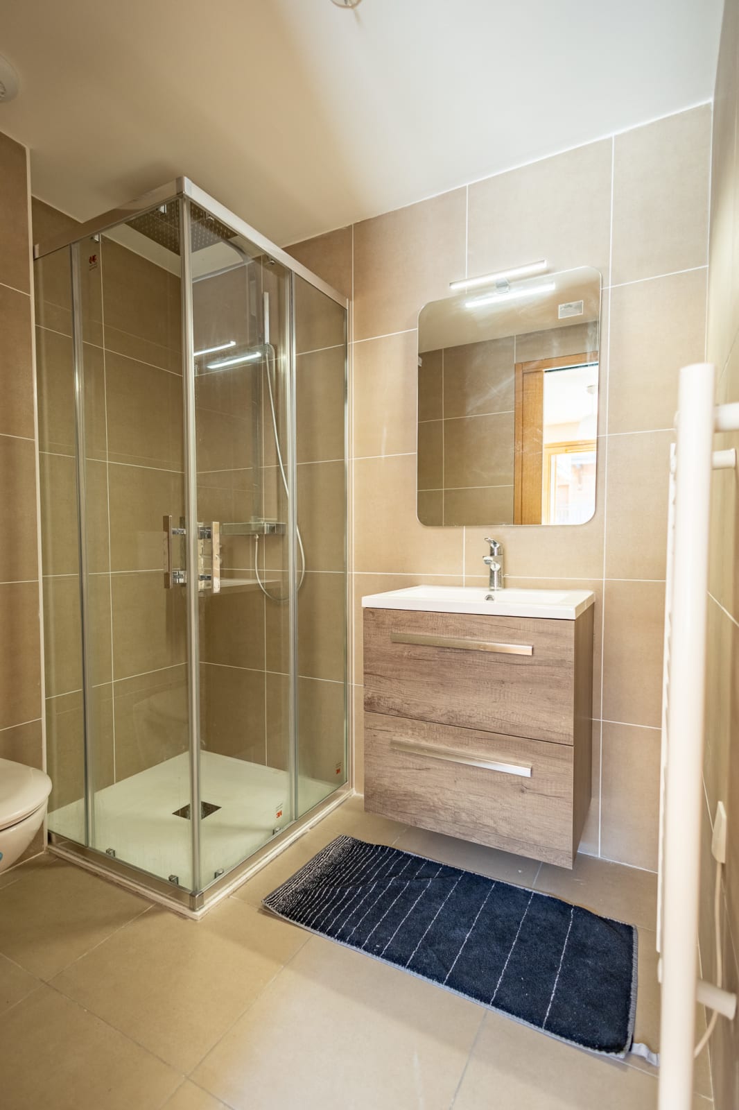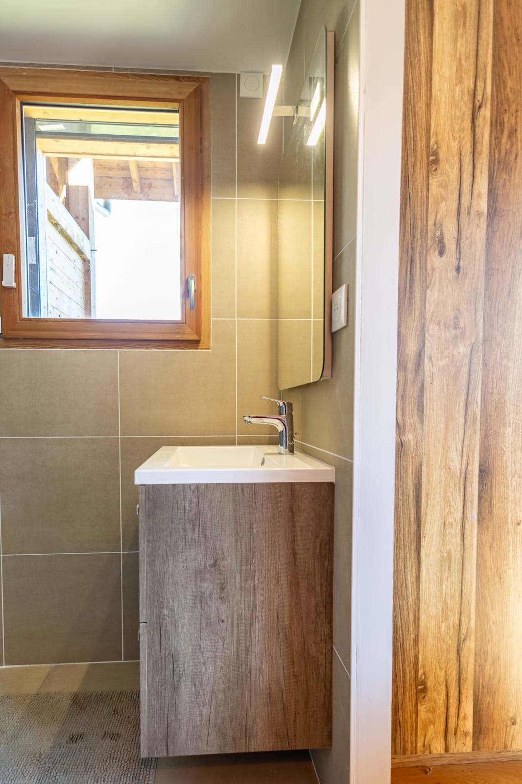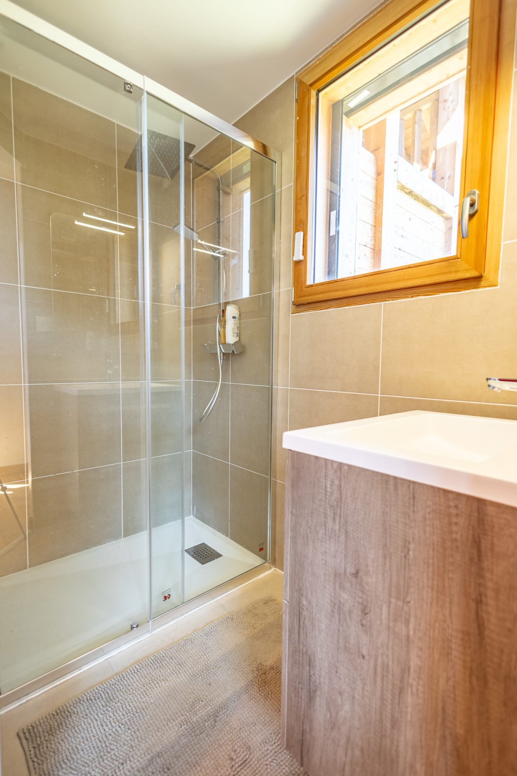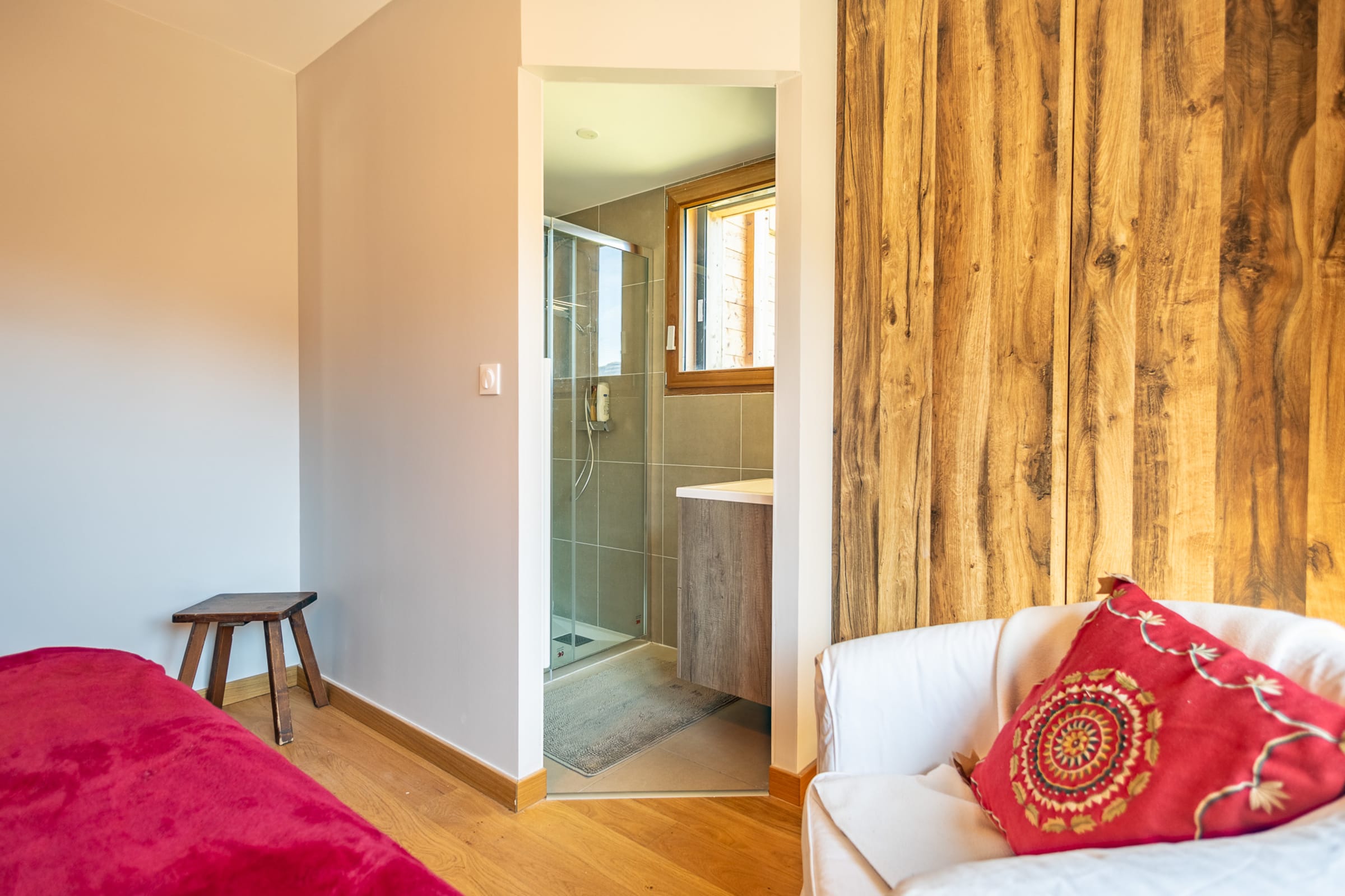 - Une chambre parentale avec un lit double en 180 cm et une salle d’eau attenante avec douche,