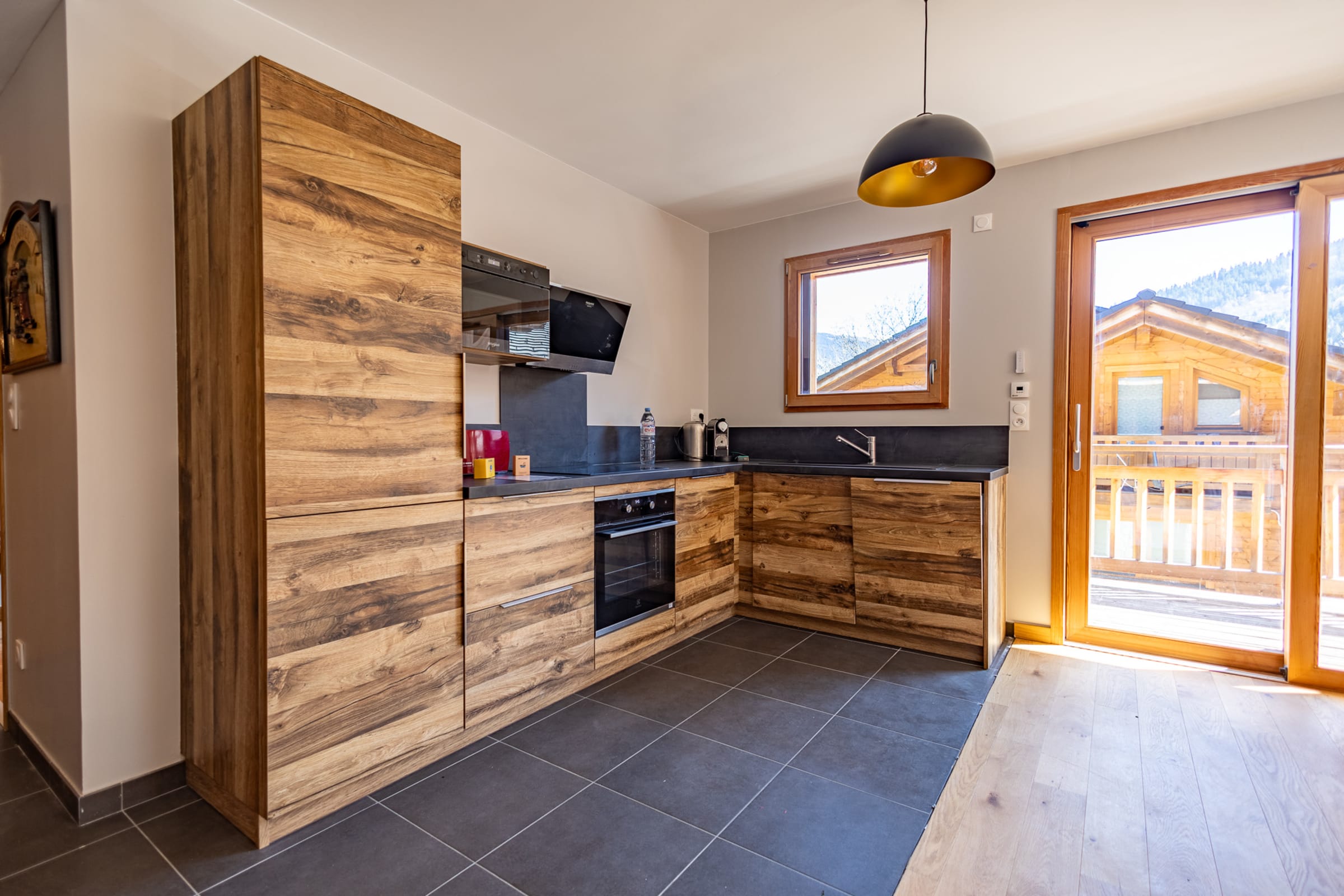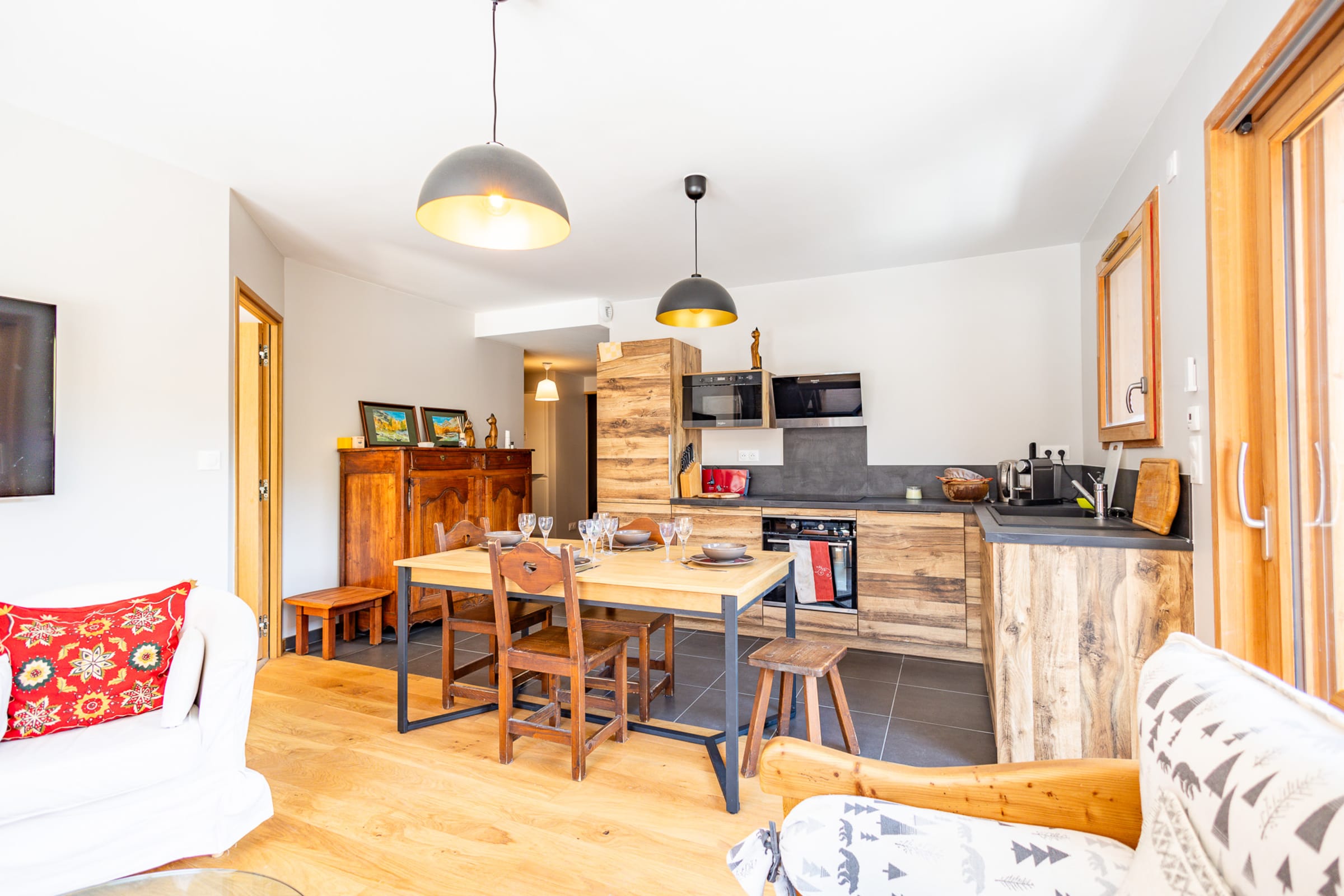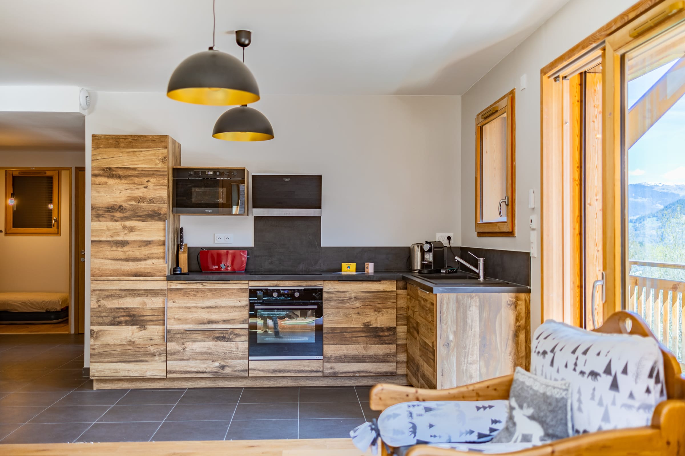L’espace de vie dispose d’une cuisine ouverte entièrement équipée (plaques, four, micro-ondes, lave-vaisselle, réfrigérateur, cafetière...), d’un coin repas, d’un salon confortable avec télévision grand écran, et d’un accès direct à une grande terrasse de 50m² exposée plein sud, idéale pour profiter du soleil et de la vue.