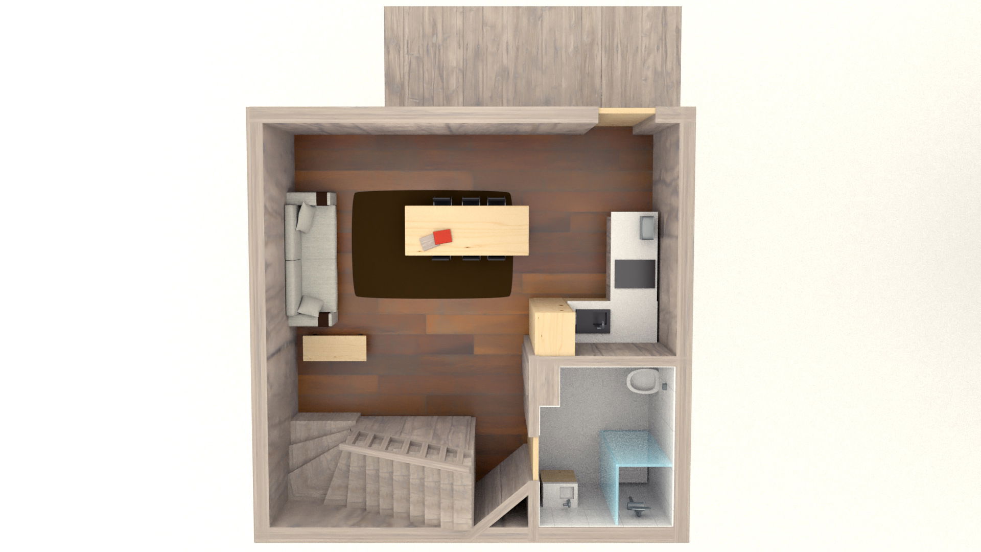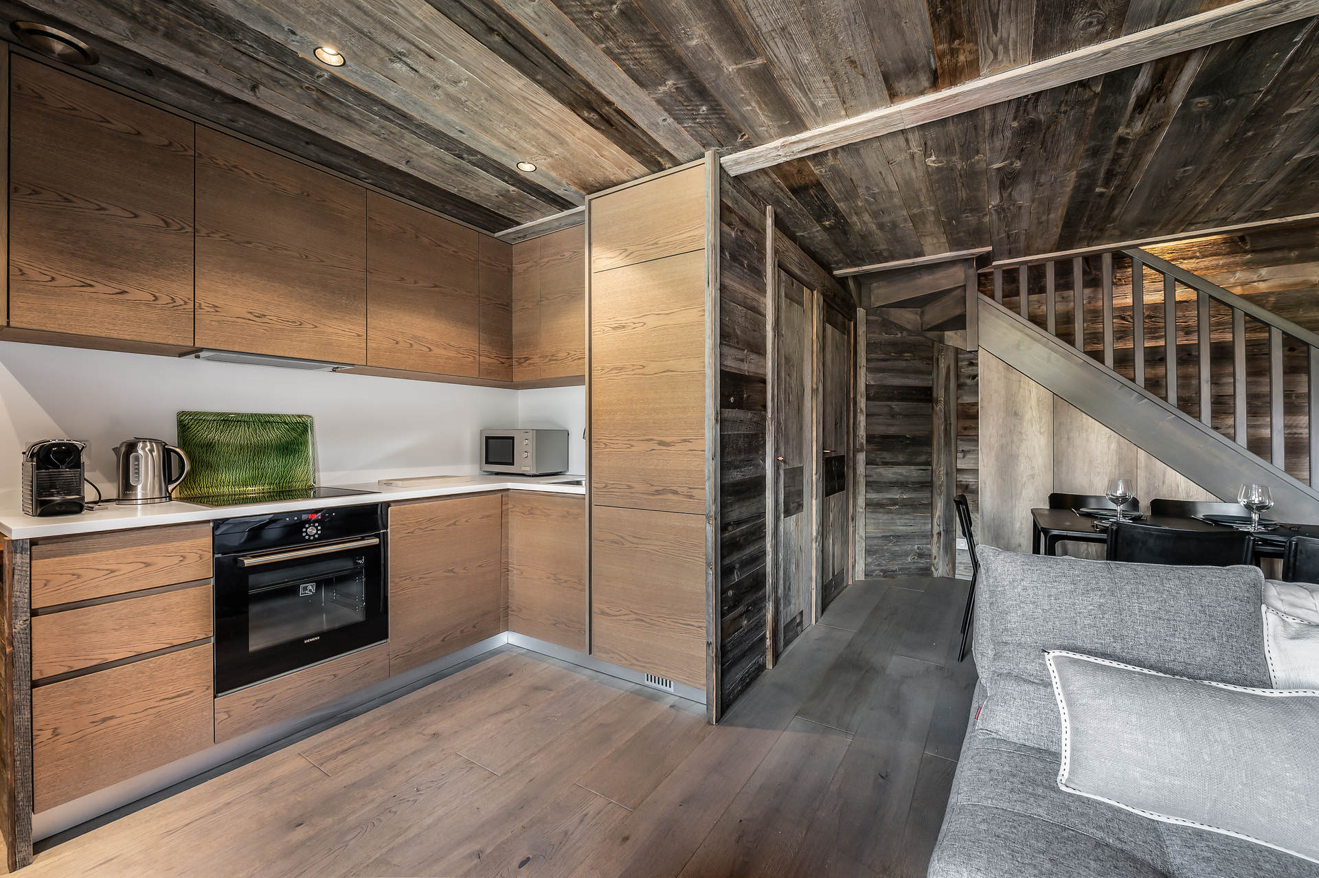- Cuisine ouverte : plaque vitro-céramique, four, réfrigérateur, congélateur, micro-ondes, Nespresso