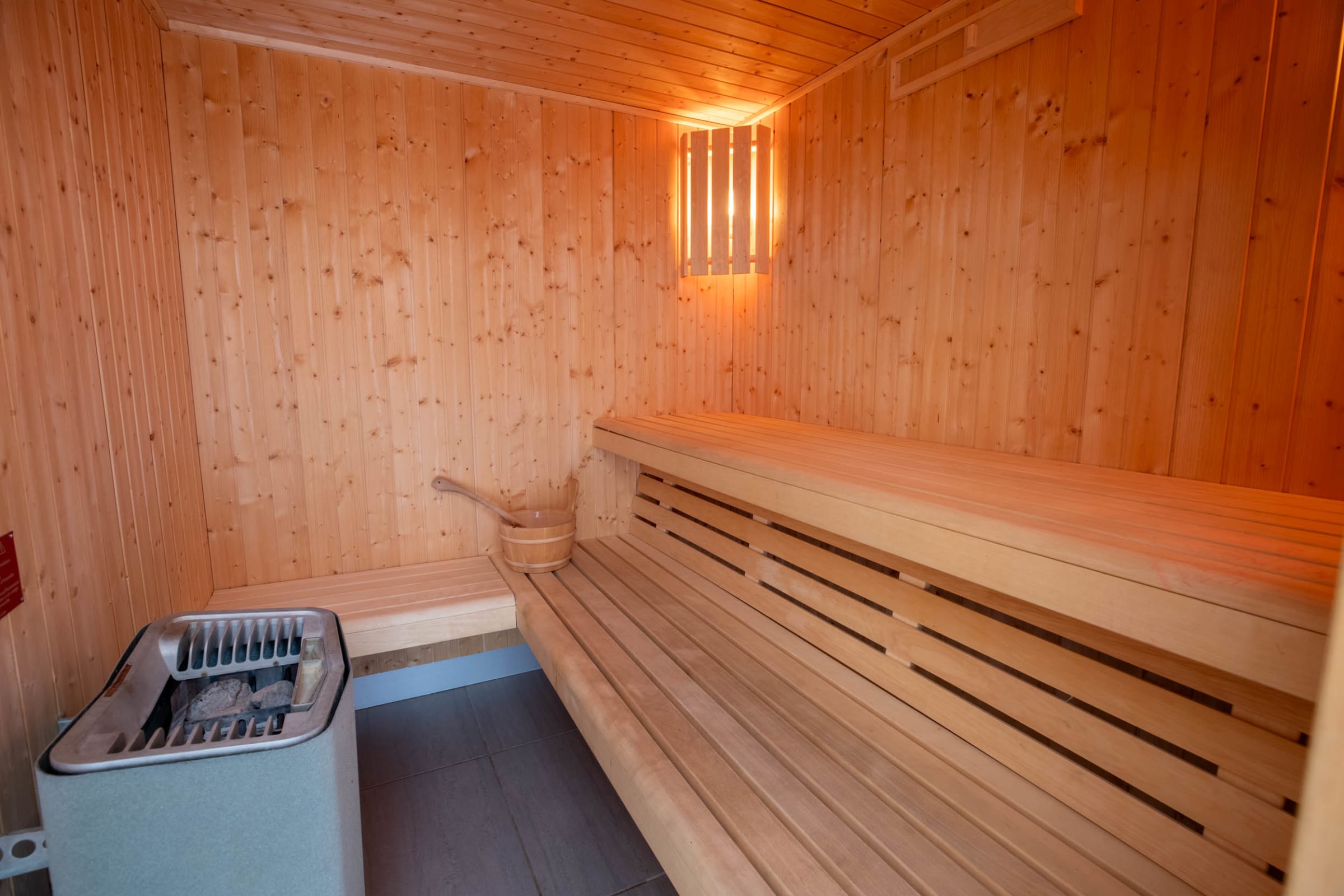 L'espace bien-être inclut un sauna avec douche, une télévision, et des transats, le tout ouvrant sur une terrasse avec un jacuzzi extérieur. Des WC séparés sont également à disposition.