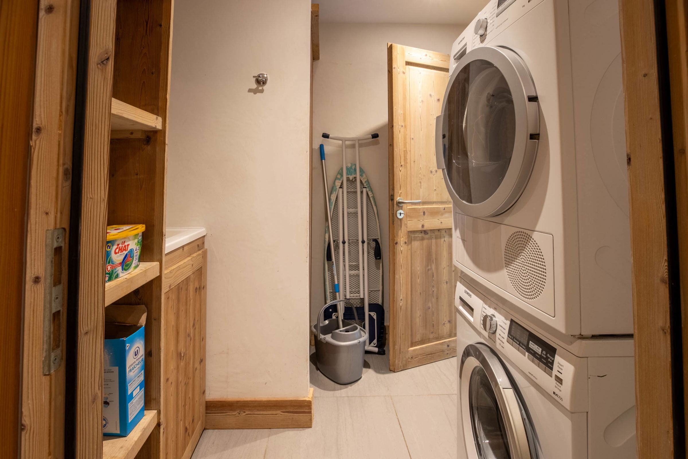 Cet étage comprend une buanderie équipée d'une machine à laver, d'un sèche-linge, et d'un espace de rangement. Vous y trouverez également un lavabo et tout le nécessaire pour l'entretien, comme une serpillière et un fer à repasser.