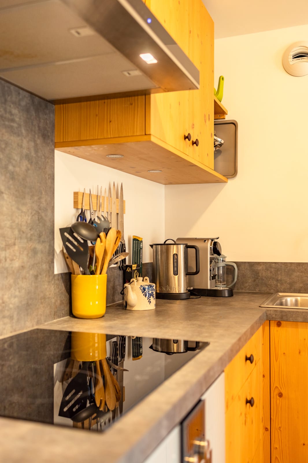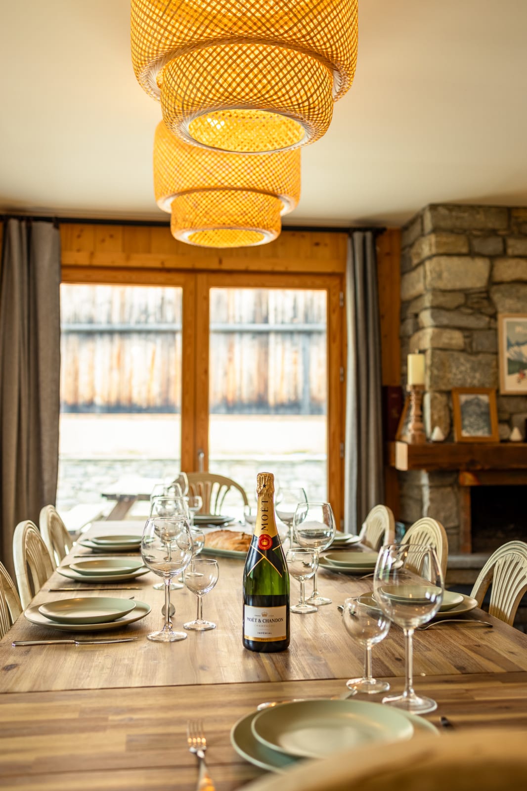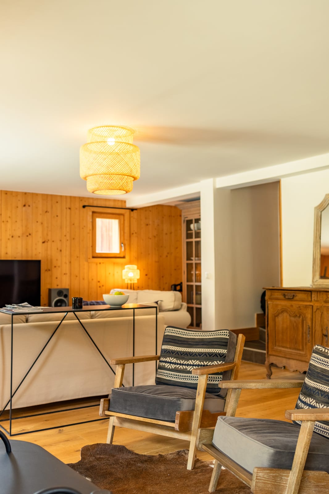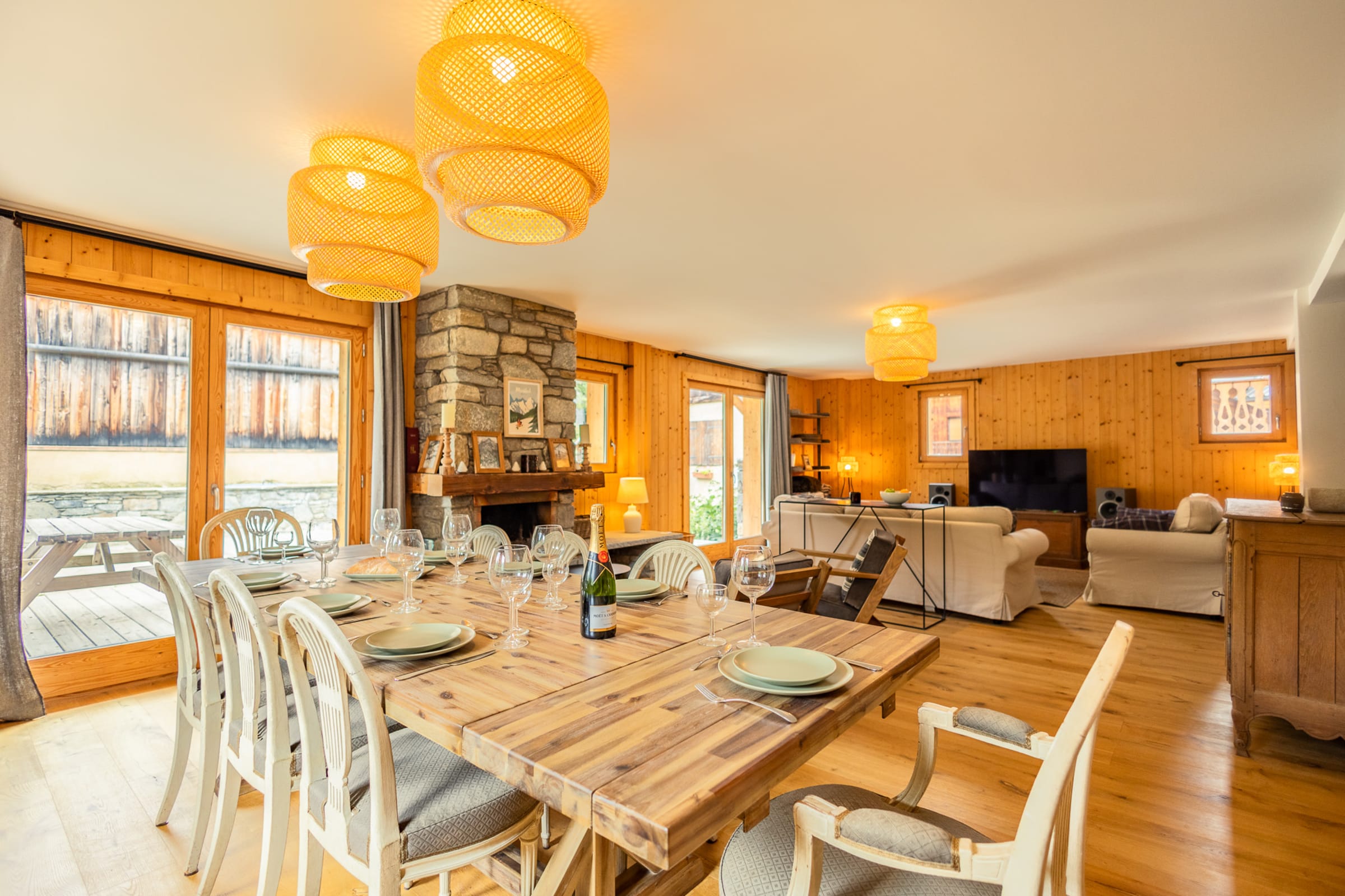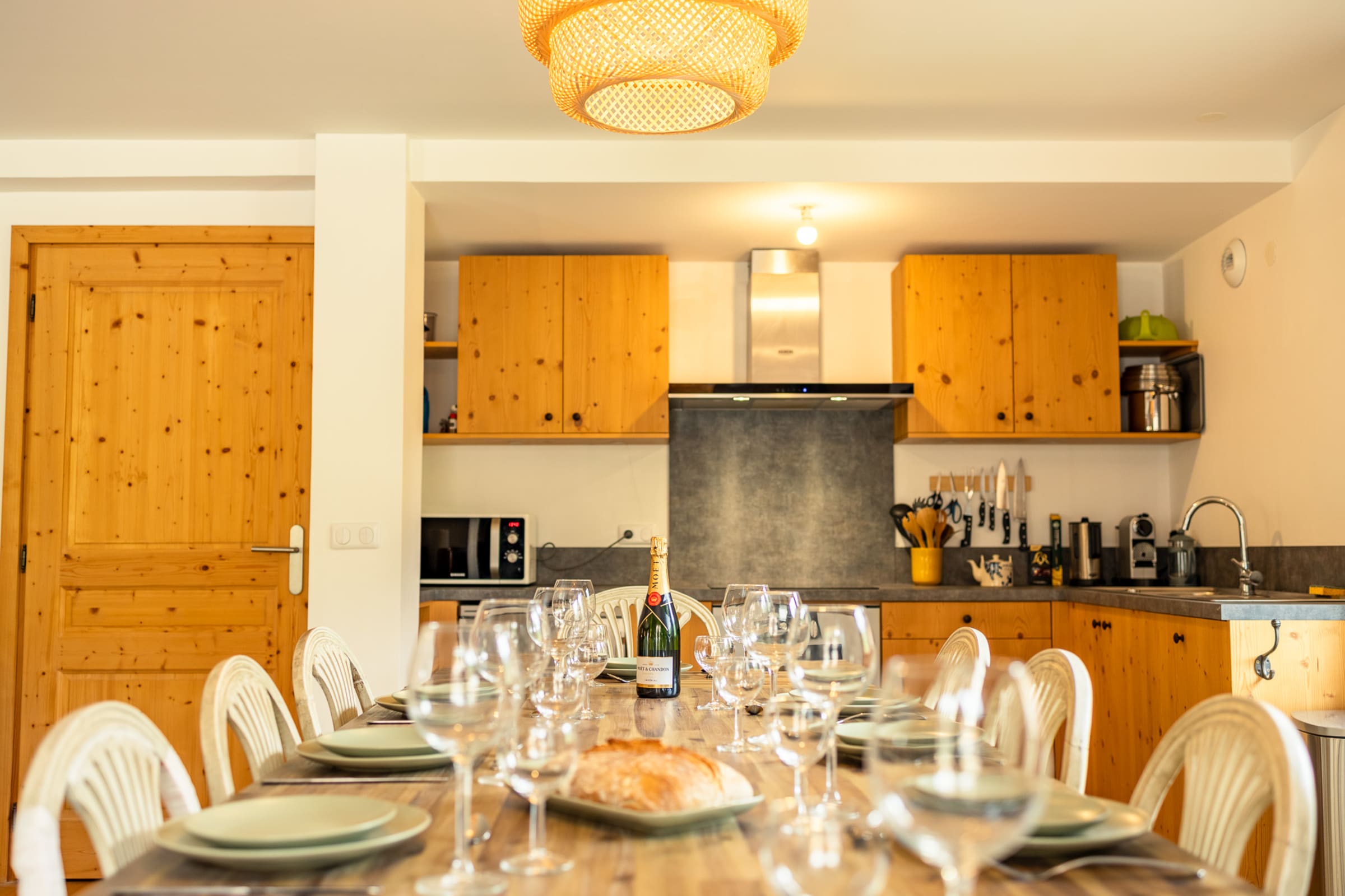 La pièce de vie spacieuse et conviviale réunit un salon avec cheminée, un espace repas, une TV avec système son et une cuisine ouverte entièrement équipée avec 2 réfrigérateurs, machine Nespresso, lave-vaisselle, etc.